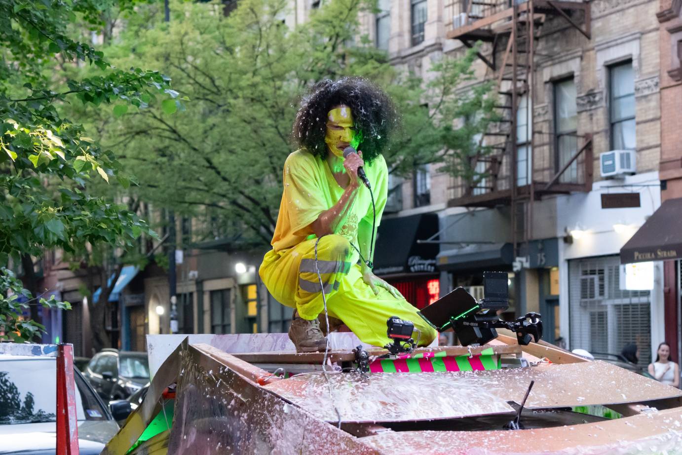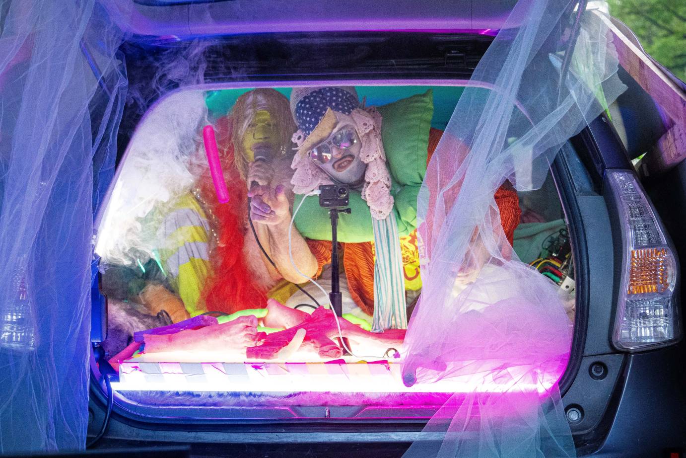 Romania reclines, half-hanging from the trunk, and pulls out a rotisserie chicken. He begins to eat. Smith shrieks, “That’s my body!” again and again, as he continues devouring it. Romania then steps out, balances the chicken atop a tripod, and strips down to his undergarments. He dances: bold, fully present.