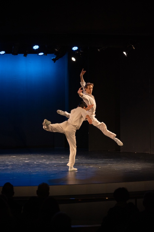 Opening the program was Lubovitch’s lyrical duet from the 1995 ice dance film “The Planets”; closing it was the duet from (2021) “Each in His Own Time.” Neither of these duets measure up to the genius of his duet from “Concerto Six Twenty-Two.” (1986). Set to a soaring score by Mozart, this male duet has a palpable tenderness, from the slow, measured barefoot walk in, heads down, one arm behind the other’s back, one hand resting on his shoulder. Their fingers open off the shoulder, rise to create an oval behind their heads. Their other arms curve inward creating a figure eight with the four arms. Slowly the upward oval curves down and the two face each other as the musical phrase concludes. Just when the woodwind solo begins, the two soar back-to-back, parallel to the floor with their arms outstretched, their heads nestled in a sculptural ecstasy reminiscent of so many George Balanchine duets. This duet captures the potency of a light touch: one rests his back on the other’s leg, lifts the other from the ground, or gently pushes the other forward. Lubovitch follows the flow of his arc, and that of the composer so that you indeed see the music. At one point, a dancer cups a ball of air and throws it. The other repeats this graceful imaginative gesture.