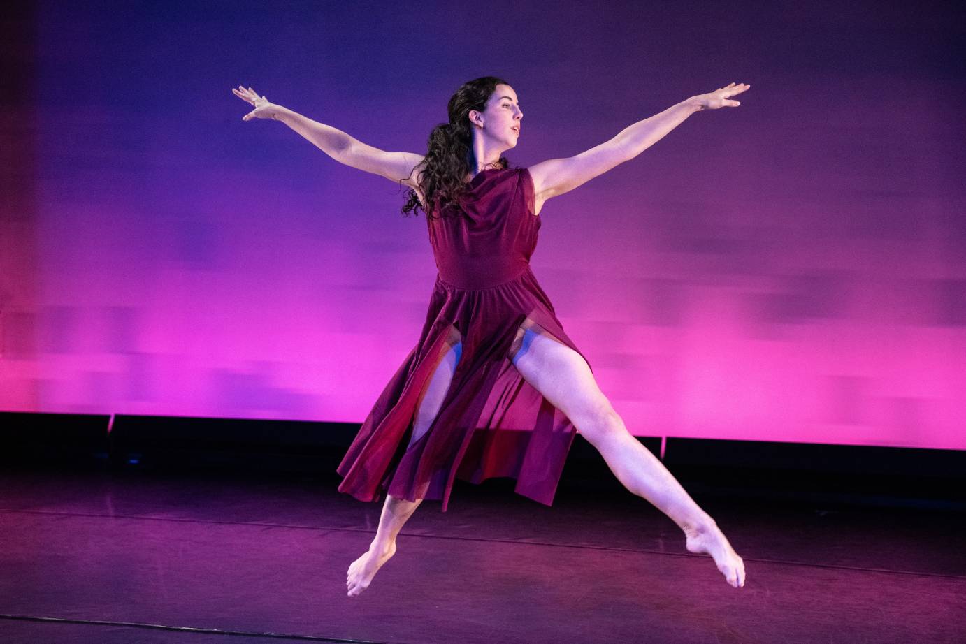 Chopin Suite closes the program. These Duncan solos, duets, trios, and quartets thrill me in their freshness. Here the young dancers impress throughout, since they have been meticulously coached. Thomas’s work ethic and dedication successfully transcend; and the whole cast looks at home. They enjoy performing to Frédéric Chopin’s Mazurkas, Waltzes, and Nocturnes. A playful duet named “Sisters,” to Mazurka Op 17 #1, makes Alexandra DiCastro and Hanna Schayes repeatedly jump away from the audience with their back leg in an inviting attitude. I am ready to get up from my seat to join them, but decide not to steal the spotlight. LaNasa’s wizardry at the piano would be even more moving had he an instrument worthy of Chopin and his own interpretive skills. One of this tinny piano’s strings must have broken before the performance; and each time a natural middle b appears in the score, a sigh emanates from the wooden box. Exquisite costuming by Ivana Drezic, and a lighting design by Kathy Kaufman that makes everyone shine contribute to the success of Thomas’s heroic effort.