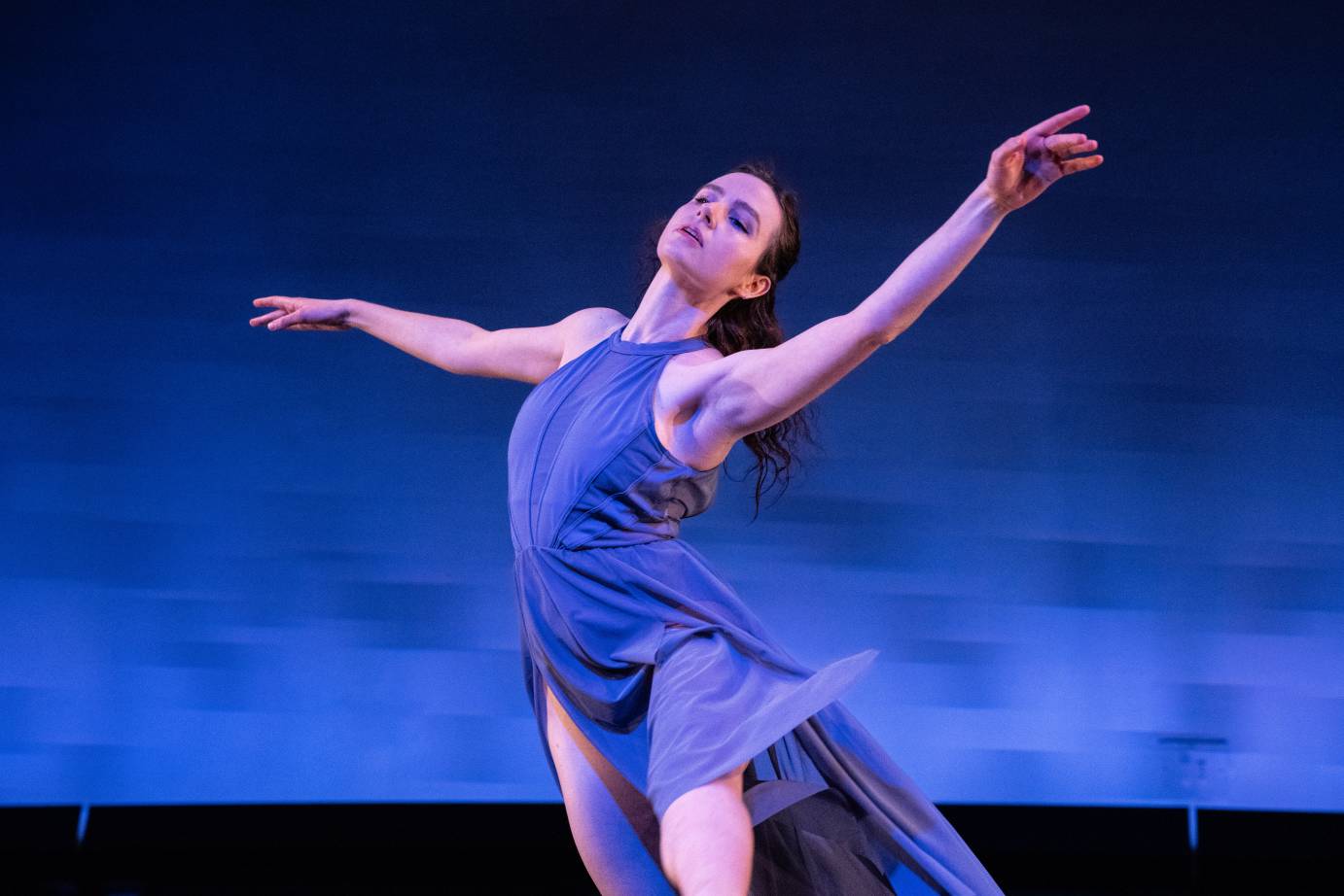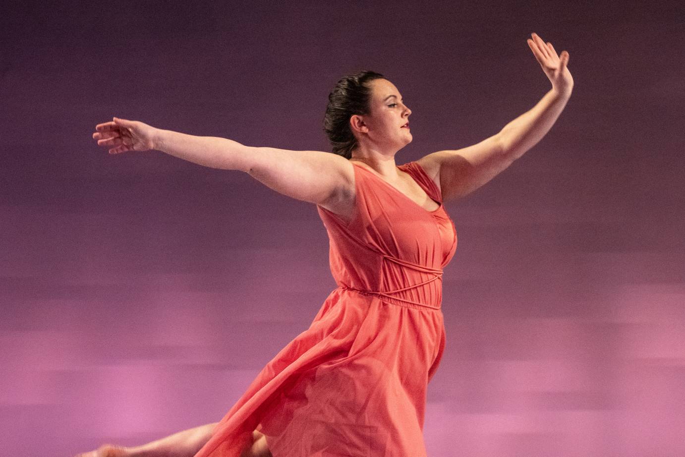 Brief solos introduce four dancers to the music of Darius Milhaud in Thomas’s Saudade. Their gorgeous tunic dresses all differ in color and design, and allow the movement to flow in harmony. While the first solo in light blue comes across as tentative, the maroon adds life. With its witty phrasing, the dark blue slaps on a dash of humor; and the salmon-colored one offers a return to melodic line. Not every one of these dancers is experienced enough, but the work compels me to watch with interest, if not always with ease.