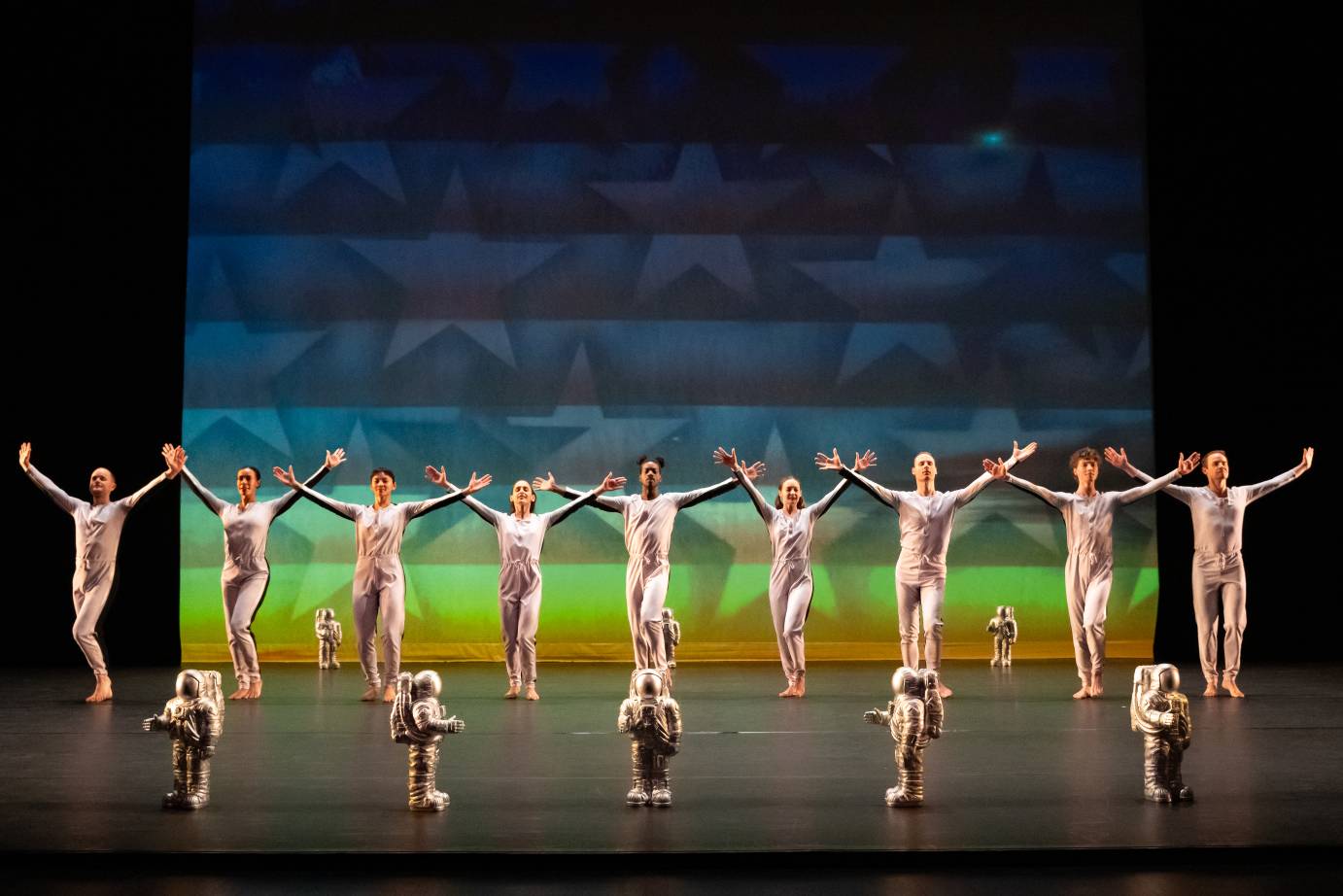 As the piece launches, we see a projected row of stars traveling up the backdrop. As they start to form a circle the colors clue us that they will soon become part of the Seal of the President of the United States. But the big surprise is what follows, an ascending image of President John F. Kennedy. The enormous ovation the likeness elicited from the opening-night audience felt only partially prompted by historical appreciation and more, I suspect, by the desire to register discontent with JFK’s contemporary counterpart. To a George Gershwin song proclaiming the “dawn of a new day, the American way,” the dancers perform an entertaining show-dance routine, referencing precision chorus-line work, marching band maneuvers, and 1930s movie-musical choreography.