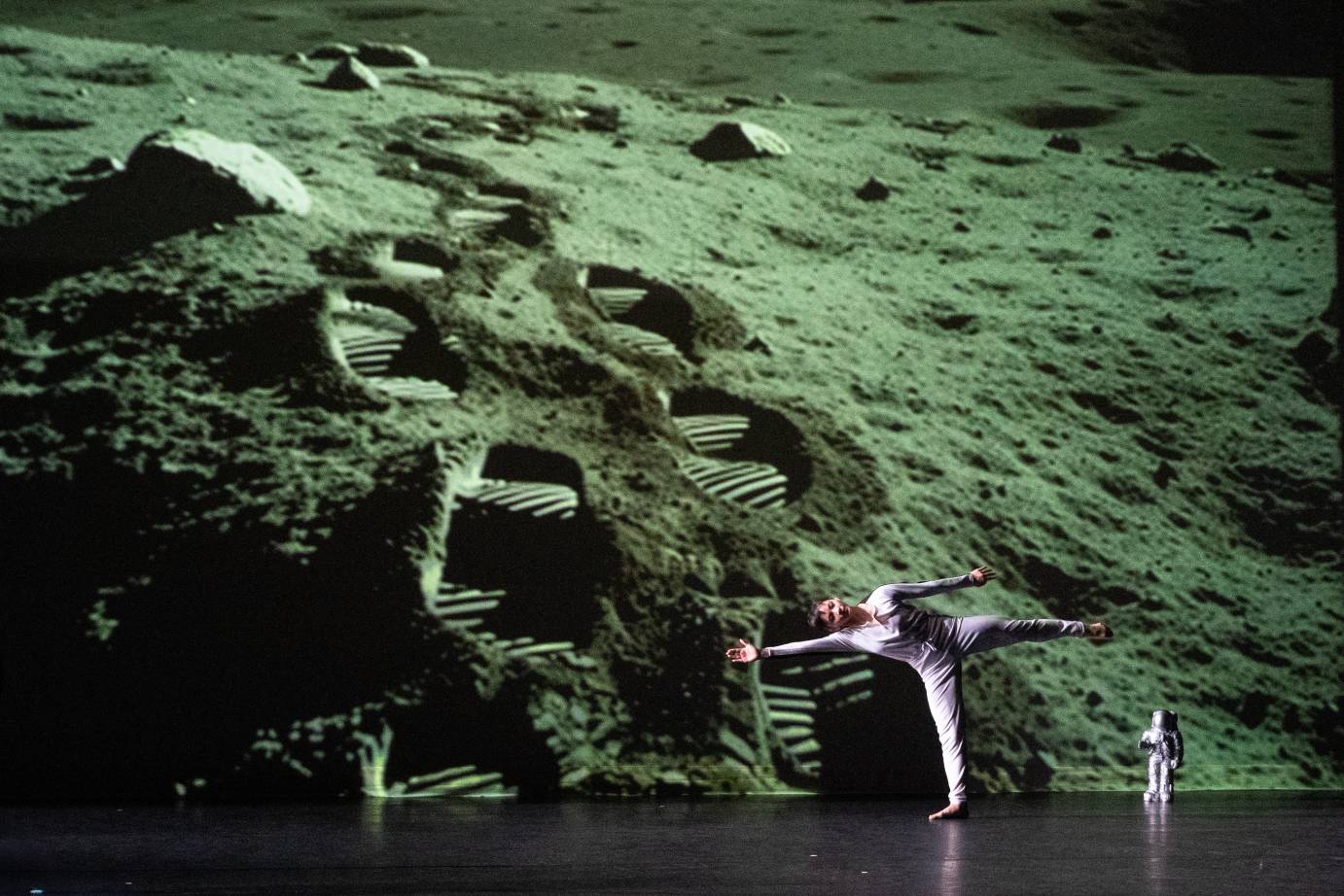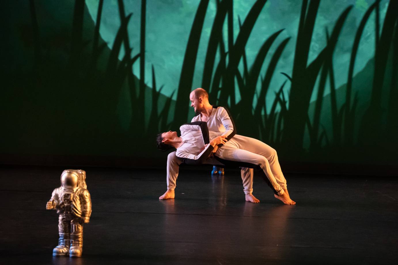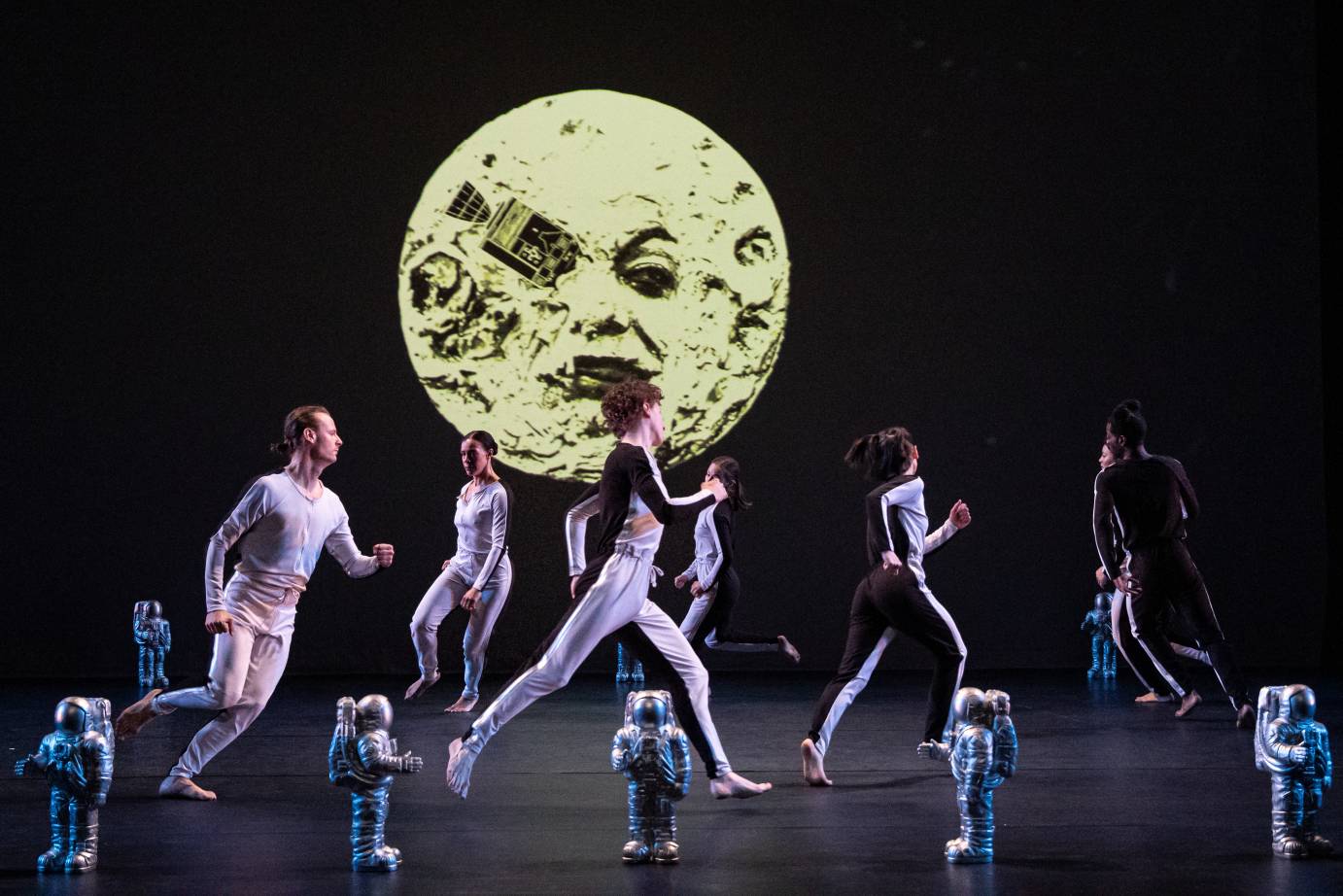 Throughout the piece, the stage is littered with adorable little astronaut statues, created by Ottmar Hörl, that look like action-figure toys. Their presence insists that one view Morris’s moon “explorations” without ever losing that child-like sense of wonderment. Though the statues are re-arranged from time to time – in framing lines, or clumped in corners like opposing armies observing the action – they are not really integrated into the choreography. The kid in me wanted to see the dancers play with them a bit more. Costumed by Isaac Mizrahi in loose-fitting, long-sleeved jumpsuits – white on the front, and black on the back – MOON’s nine dancers suggest the light and dark sides of the moon, or perhaps pajama-clad youngsters lured to view the mysterious object shining in the nighttime sky.