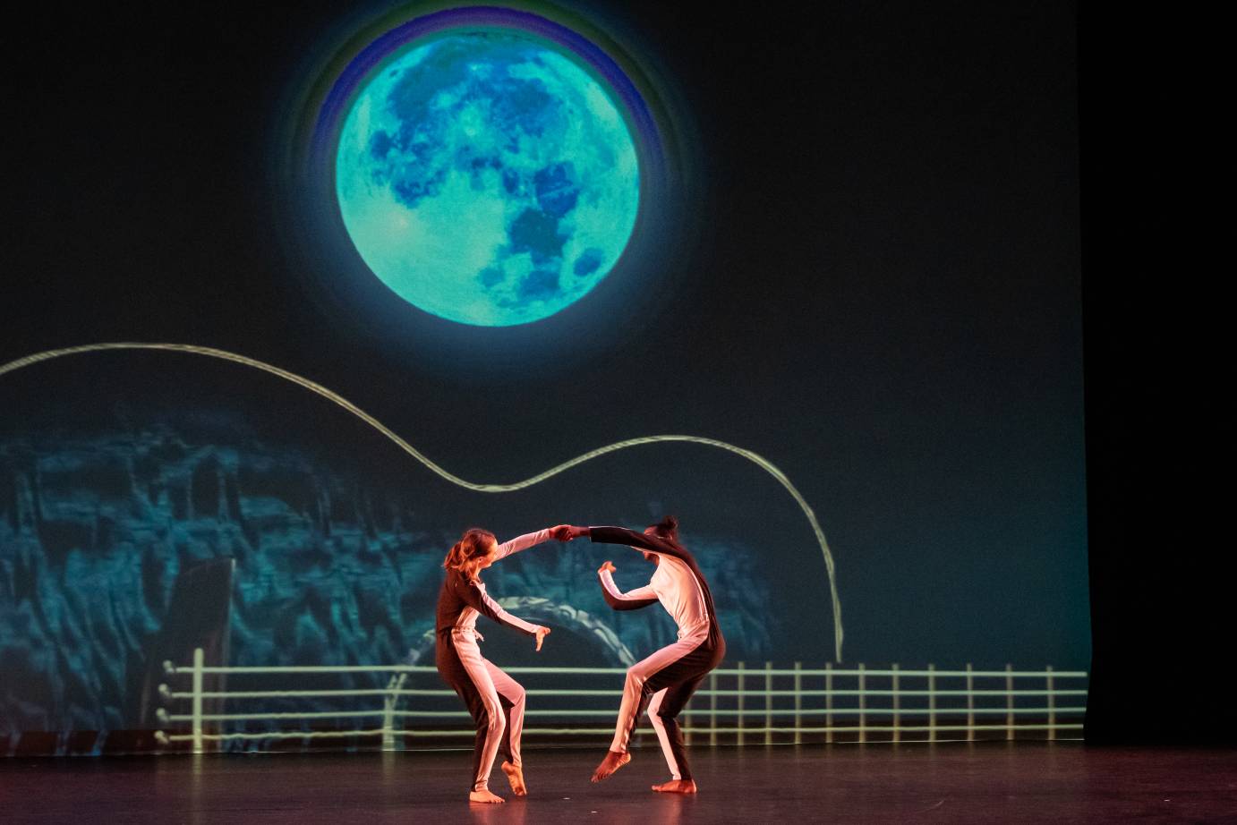 So, it was with both nostalgic and topical eagerness that I anticipated the New York premiere of choreographer Mark Morris’s MOON, a light-hearted, 55-minute dance piece celebrating our personal and cultural fascinations with the moon. Performed by Mark Morris Dance Group, at Brooklyn Academy of Music the weekend preceding Holy Week, the piece constituted the first of two programs presented by the Brooklyn-based company. The second program comprised two equally timely Morris works: V, a magnificent pure-movement piece dedicated to New York City that premiered in the U.K. a month after the September 11 attack on the World Trade Center (that event’s 25th anniversary will be commemorated this year); and the New York premiere of Via Dolorosa (2024), a weighty dramatic dance inspired by the Stations of the Cross (a 14-part, processional devotion tracking the final day of Jesus’s life), appropriately timed for this pre-Easter weekend engagement.