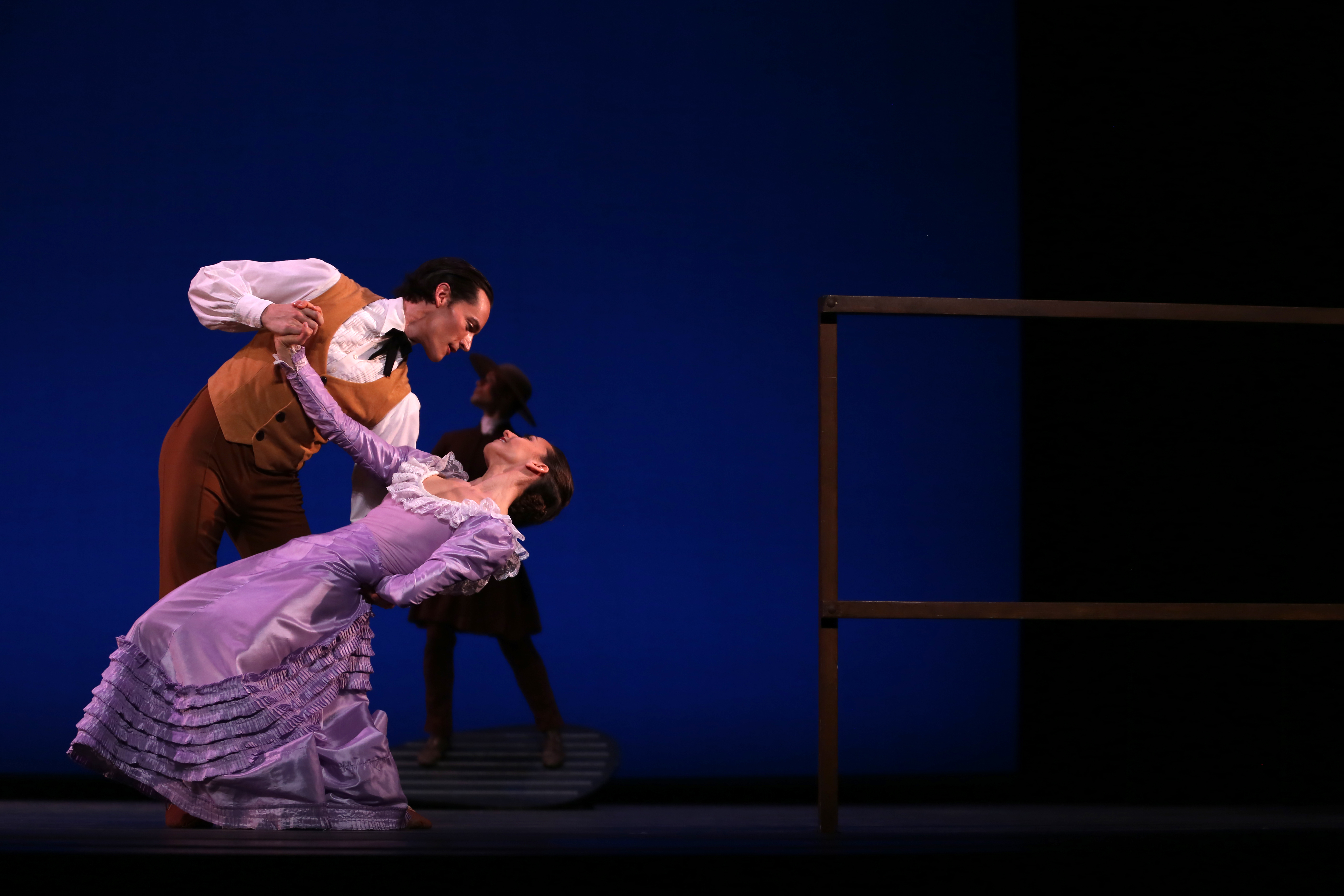 The Martha Graham dancers are wonderful dramatic artists, who make the most of de Mille’s arch characters. Laurel Dalley Smith turns the Cowgirl into a pathetic waif, while Marzia Memoli’s Cowgirl is a frustrated tomboy. Alessio Crognale-Roberts portrays the Head Wrangler as a wind-burned stoic, tough as rawhide. If this character could speak, you know he would say, “Go ahead, make my day.” Lloyd Knight brings studied details to his part, walking with a crick that suggests he has spent hours in the saddle. In contrast to the Head Wrangler’s reserve, the Champion Roper is an enthusiastic skirt-chaser and a show-off. Richard Villaverde and Jacob Larsen both turn up the charm — but pity the ingenue who expects this windvane to remain constant. As the Ranch Owner’s Daughter, majestic Leslie Andrea Williams accepts the Head Wrangler’s attentions as her due; while So Young An flirts deviously. Even with such delicious performances, however, Rodeo suffers from de Mille’s constitutional inability to take risks. As a satire of Western mores, it is less amusing than the farting-around-the-campfire scene in Mel Brooks’ Blazing Saddles. As a satire of a woman struggling with traditional gender roles, it is less wicked than the sodomy scene in Lina Wertmüller’s Swept Away.