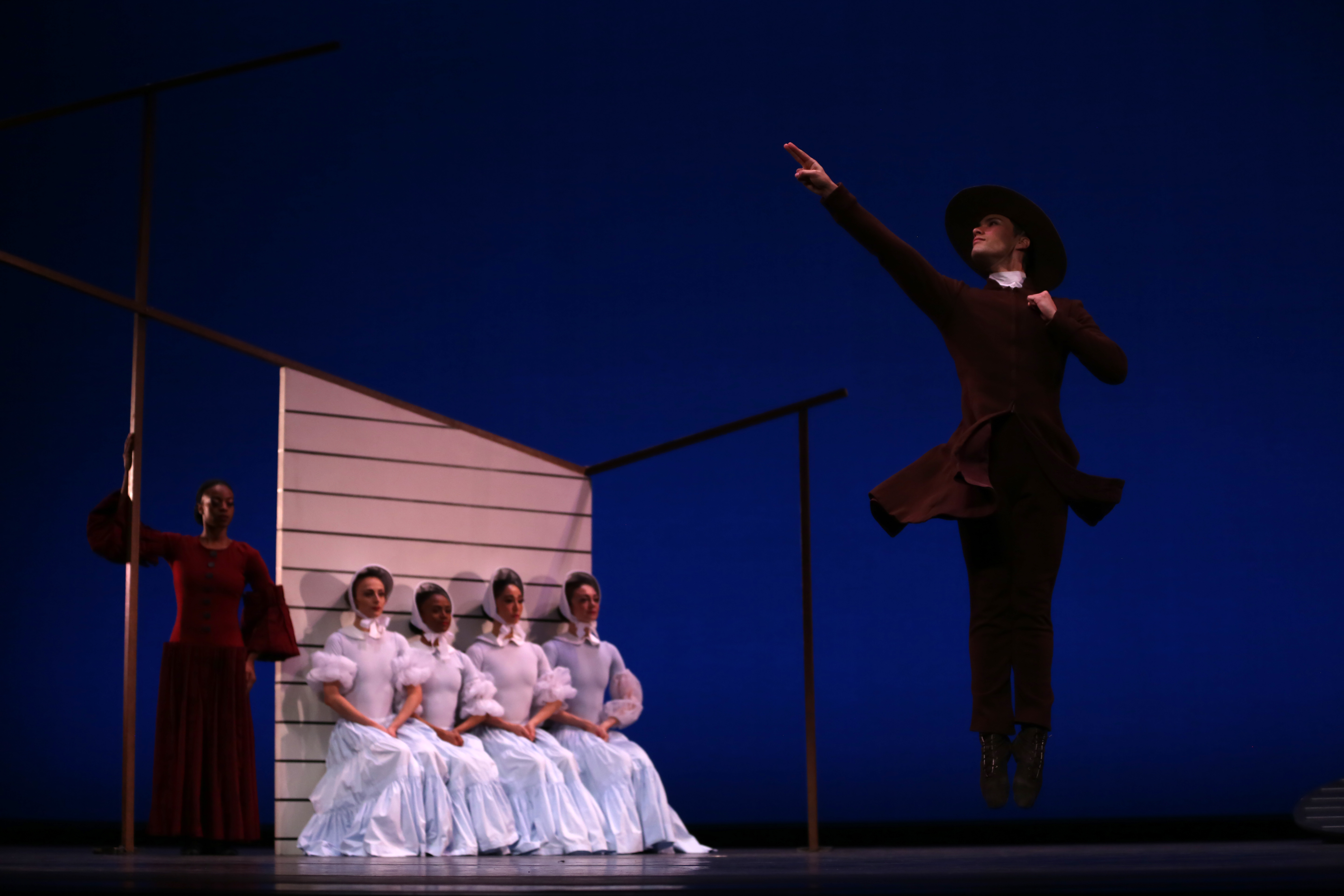 The Graham company now fields an ideal cast in this masterwork. Anne Souder makes a sprightly Bride. She fans her shoulders excitedly and flings herself into a scissoring leap, reaching for an invisible prize. A callow Husbandman, Jacob Larsen slaps himself in delight at the prospect before him, and hastens to celebrate hooking arms with the Bride in a round so energetic they almost levitate. Alessio Crognale-Roberts is the Preacher, stern yet erratic, who falls into the arms of his flock so they support his rapture. Leslie Andrea Williams brings lush expansiveness to the role of the Pioneering Woman.