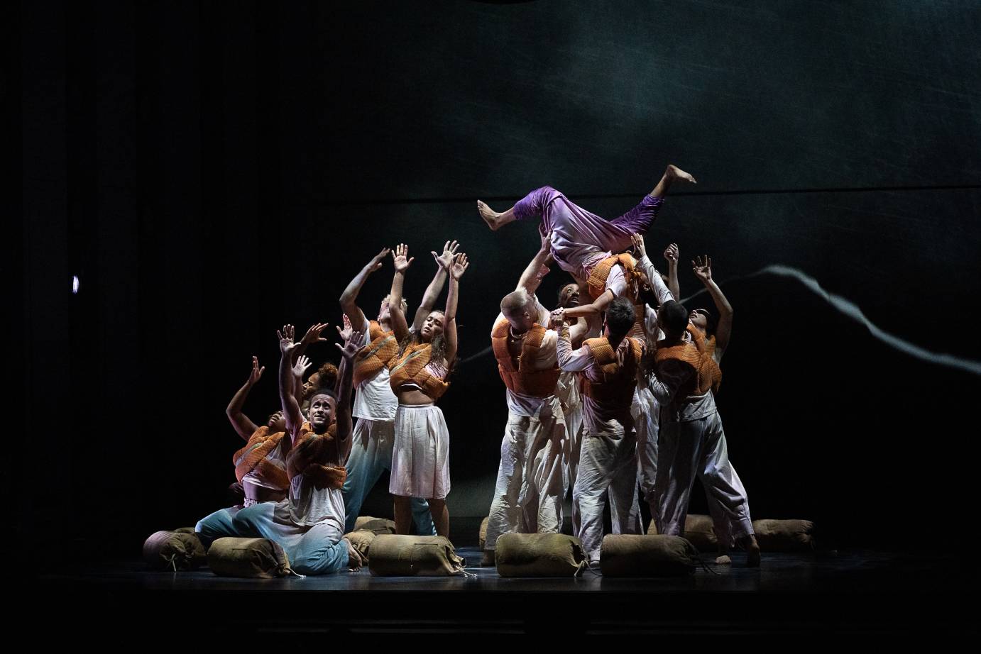 While thrilling, and likely designed to maintain viewers’ attention, ironically, it becomes a distraction that compromises our ability to stay focused on any segment of the choreography long enough for it to deeply resonate. For instance, powerfully unnerving images of refugees crowded together on a rickety boat arise out of Prince’s clever arrangements of a clump of bodies clutching satchels and life jackets, backed by video designer Andrzej Goulding’s chilling projections of ferocious waves and torrential rain. We feel their anxiety, their petrified communal breaths, as the clump expands in and out on itself while the boat rocks on the rough seas. But just as the effect starts to take hold of us emotionally, one dancer, as usual, separates out from the group to perform some fancy b-boy freezes. What is he doing out there in the middle of the ocean? “Stay in the boat, you idiot,” I wanted to shout.