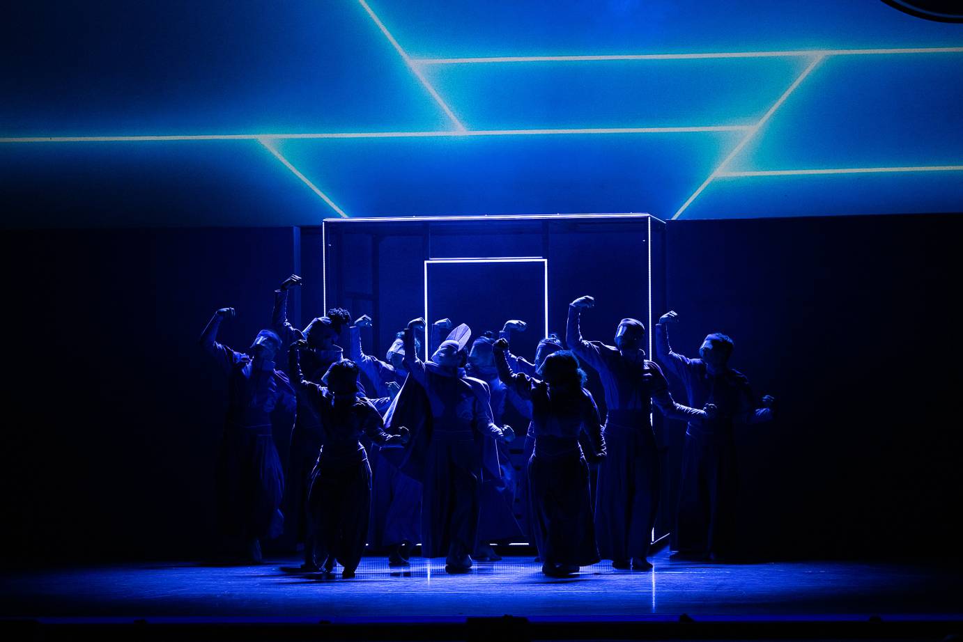 Yet the most intriguing component of this big, loud production is its only subtle element: the hanging orb. A literal reference to the storyline’s metaphorical, hope-providing “invisible sun,” the circular cut-out sports wee marks that register as eyes and lips and vary from number to number to form changing expressions. Sometimes the “sun” looks down on the action with protective warmth, while other times it smiles kindly, displays concern, or gasps in shock. In the second act, it wears a vertical-striped “mask” of neon lights that disguise, but don’t completely obliterate, its facial features. I found myself re-visiting it often throughout the boisterous evening, driven, I think, by a need for some moments of understated expressiveness.