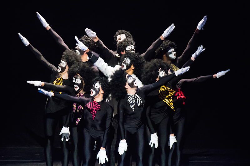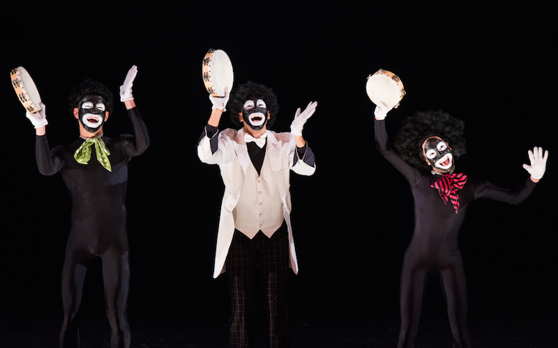 Despite its historicity, The Minstrel Show remains contemporary. When two female clowns join Crozier, flanking him after his opening monologue, the fluorescent nipples on their breasts are our first clue that this program will link past and present targeting other forms of exploitation as well as racism. While referencing antique dances like the Waltz, the Charleston and the high-stepping Cakewalk, the performers wear sleek, modern unitards and their dance vocabulary incorporates gyrating, burlesque moves; balletic arabesques; backflips, cartwheels and acrobatic partnering. Byrd’s long-time collaborator, composer Mío Morales, supplies an accompaniment that honks and tinkles incorporating Scott Joplin’s jaunty rags.