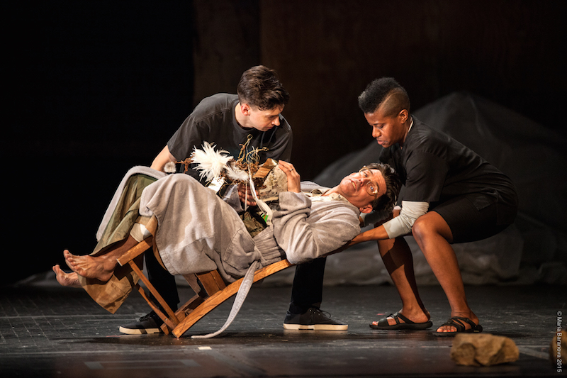 A chorus of three performers dressed in black invite us to see how the story unfolds. Blow, John Gasper, and Karen Kandel alternatively embody hospice workers, rock musicians; characters in the old king's fantasies, and narrators. While their main function is to care for and prepare the king for his trip, they also tether us to the earth. They tell us where we are and remind us that our perception of reality will come into question at times. Storms, whether external or internal, blur lines.