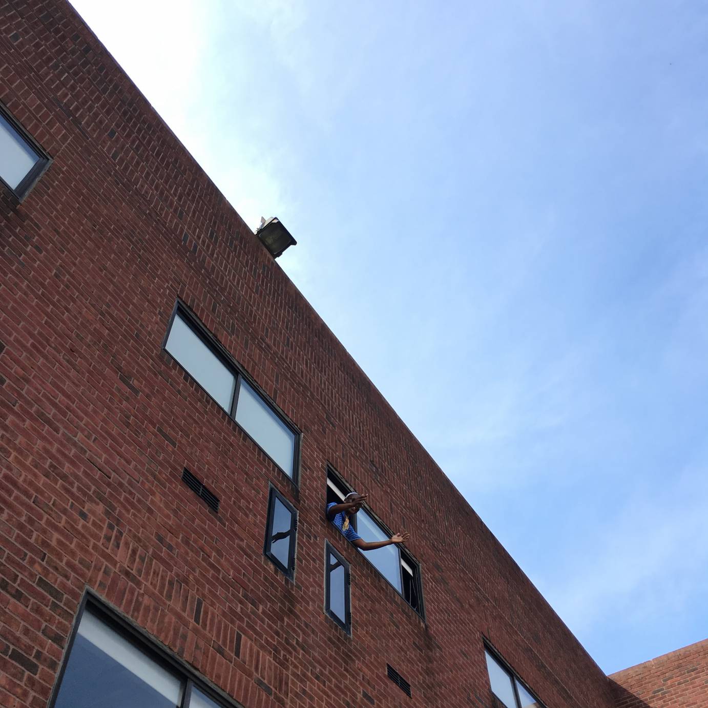 In the audience, Trinity Bobo, attired in a fancy blue dress, dons bracelets and reposes on a giant Styrofoam hand. Three performers file in, a finger pointing upward, as an older woman gazes out a window, several scarves knotted together dangling below her. Behind me, a man marches with cymbals, first held apart noiselessly; later, he clangs them together with ear-piercing precision.
