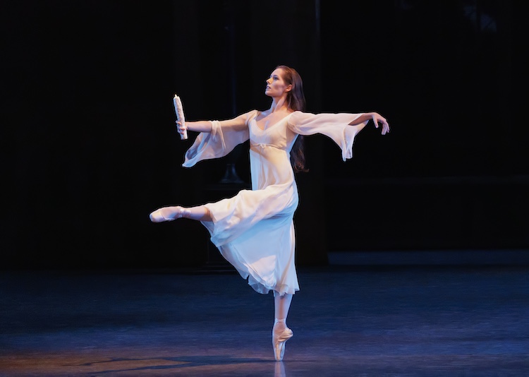 As the title character in La Sonnambula, Phelan pretends to sleepwalk through what arguably might be Balanchine’s most poetic ballet. The way she gently sways and seemingly lets the night wind and the moonlight guide her movements belies her steely balance and strength. No wonder Taylor Stanley (as the Poet) is entranced by her, which, in turn, makes Ashley Laracey (Coquette) so jealous that she initiates a sequence of events that ends in murder. Daniel Ulbricht as the jester with high-flying jumps and expert comic timing ensures that the ballet is not a downer. Phelan gets the dead poet “to go” and carries him off stage.