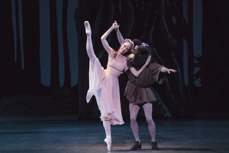 Reichlen portrays Titania with striking graciousness and dances beautifully throughout. She shines most, however, in her pas de deux with the weaver Bottom (danced by the corps dancer Harrison Coll), who is encumbered with a donkey’s head thanks to the mischief-making of Puck. Titania, under the spell of a love potion, becomes besotted with the clumsy creature.