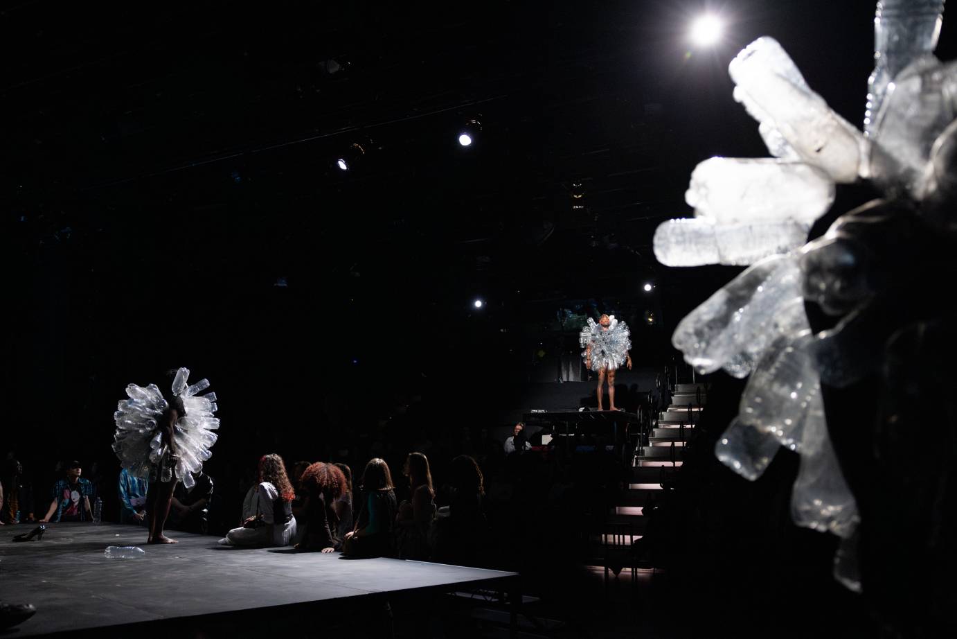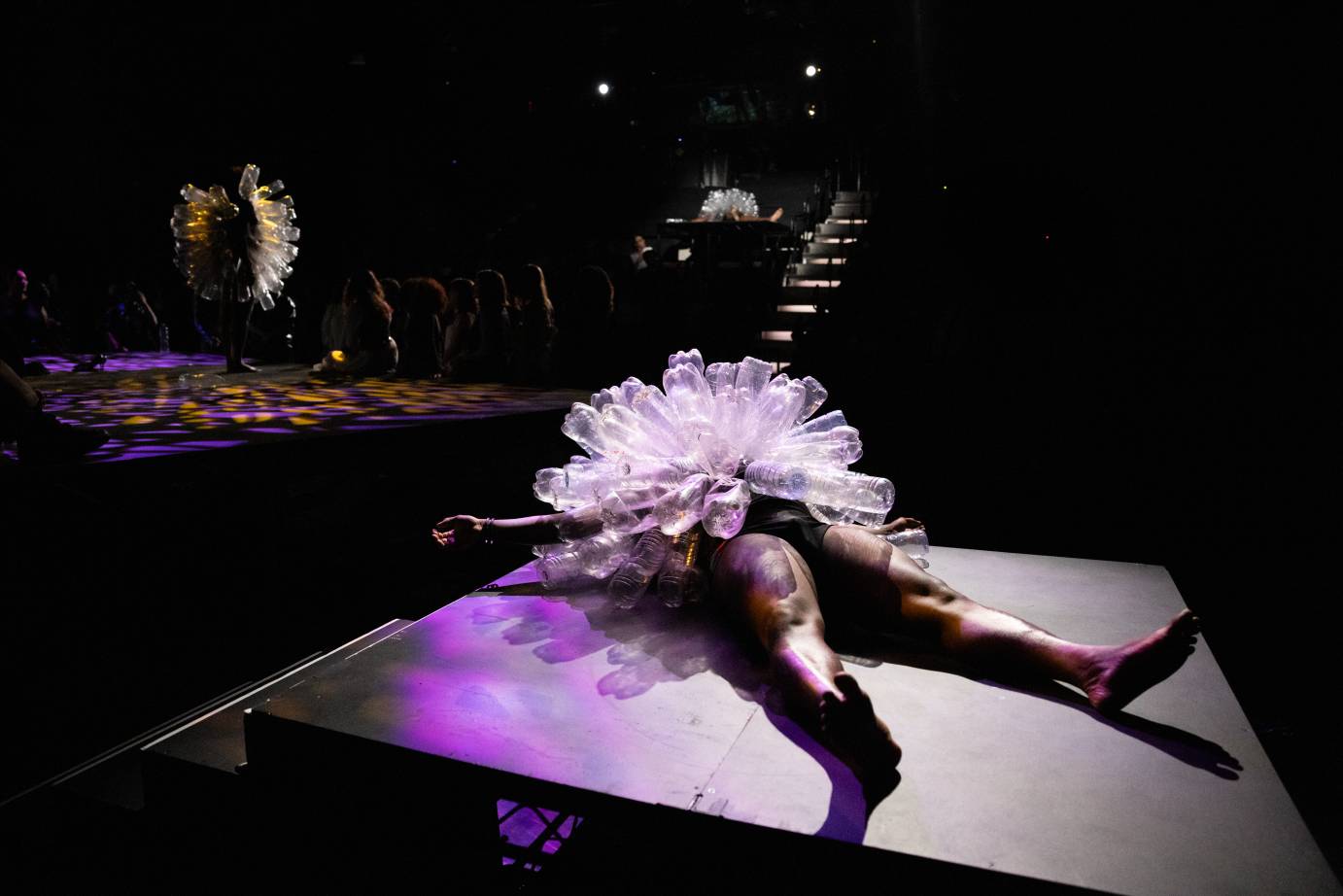 Three spherical sculptures constructed of fabric and plastic bottles — each resembling a dandelion — nestle on each platform. A towering curtain of plastic bottles hangs from the ceiling stage left.