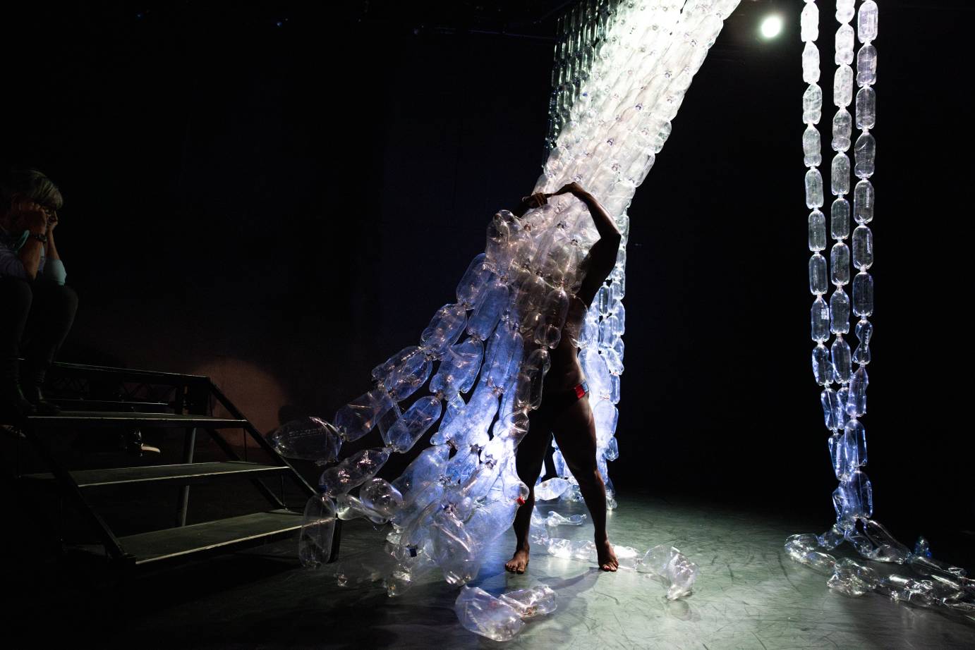 We remain transfixed as Beugré dances along the upstage wall and crawls through the curtain of plastic bottles. Sery, also wearing black undergarments, dances beneath the bottles. Gathering its strands into three sections, Sery hands two clumps to two viewers, keeping hold on the third. “One, two, three!” Sery cries. They release their strands, the bottles colliding and spilling as the curtain falls apart.