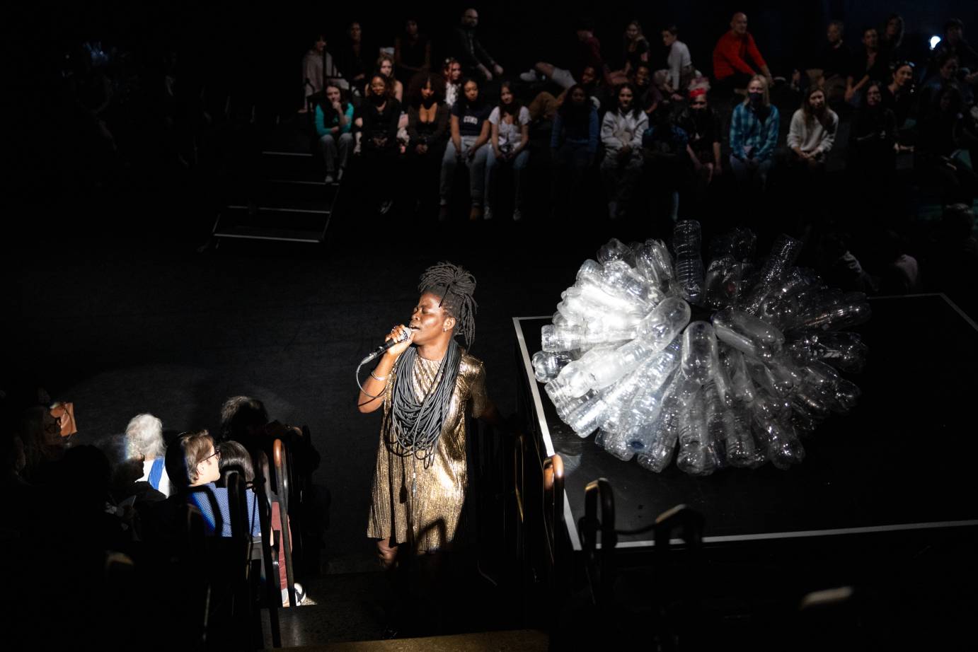 Beugré, adorned in a shimmering short sleeved gold dress and shiny black heels, enters from stage right. She holds a microphone, its mammoth cable coiled dozens of times around her neck. Circling the stage and entering the house, she approaches audience members, speaking to them in both French and English: “Bonsoir, madame… Merci… I want to sing to you…”