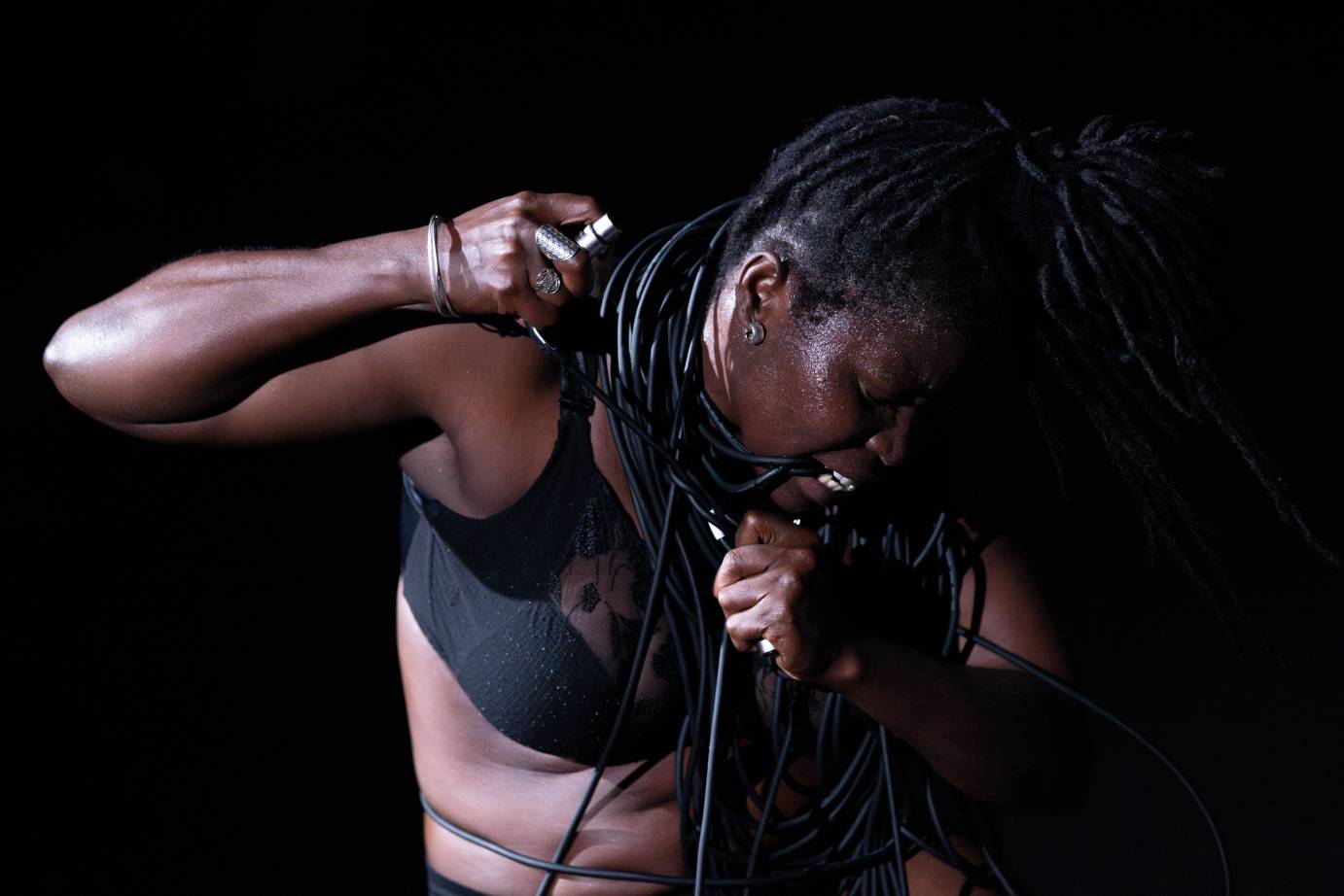 Beugré folds over and slowly peels off her dress to reveal black undergarments. Cradling her ears in her hands, she hums and sighs as she tosses her head between her hands. With great deliberation, she grasps the microphone cable and binds her thighs, torso, and neck in its embrace.