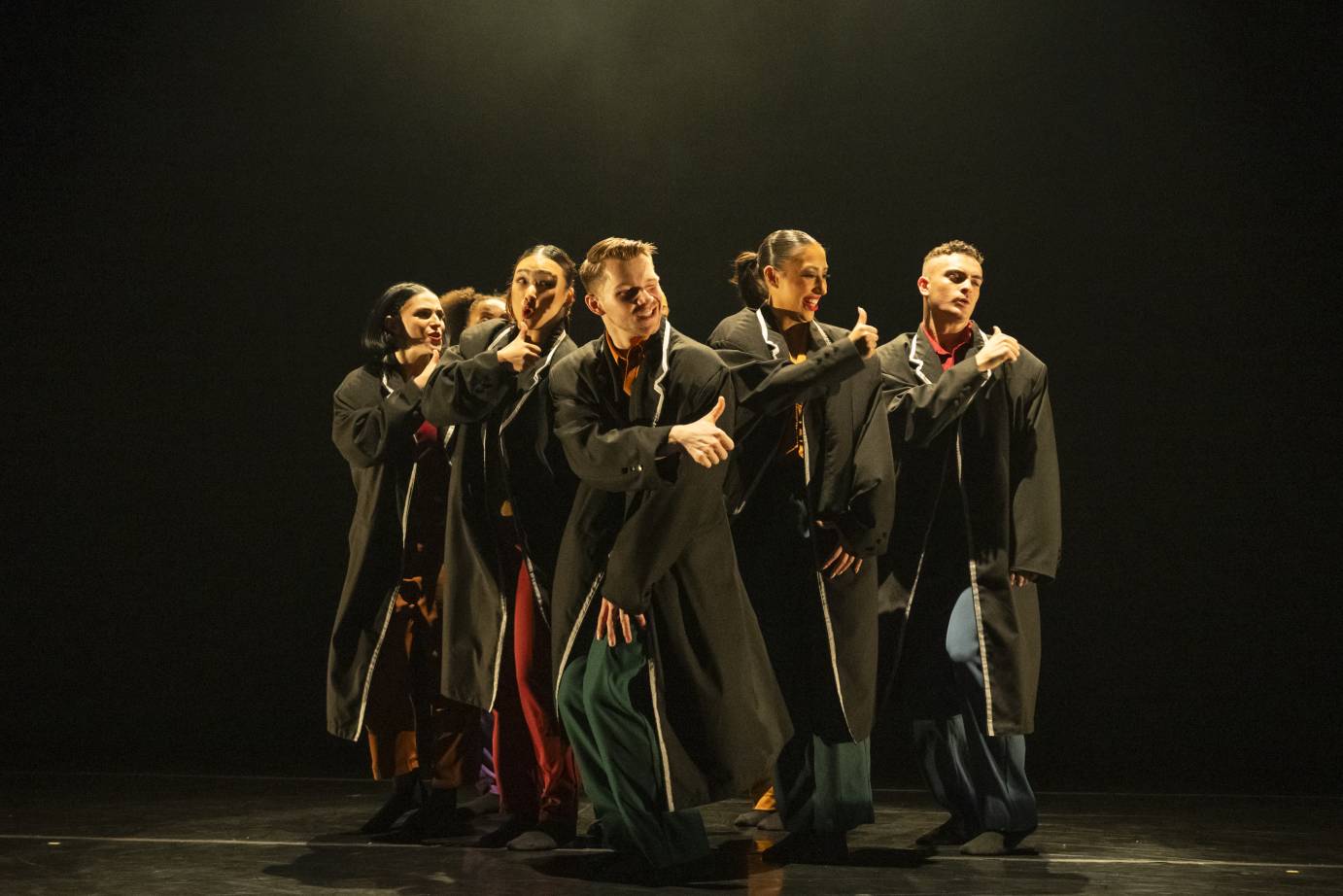 The most memorable feature of Penny Saunders’ Thick as Thieves happens to be long, black coats worn by the performers. Too bad it stays in one’s mind as a gimmick: the coats function as cushions, and, in the tradition of her Momix past, Saunders explores other non-traditional ways of using a coat.