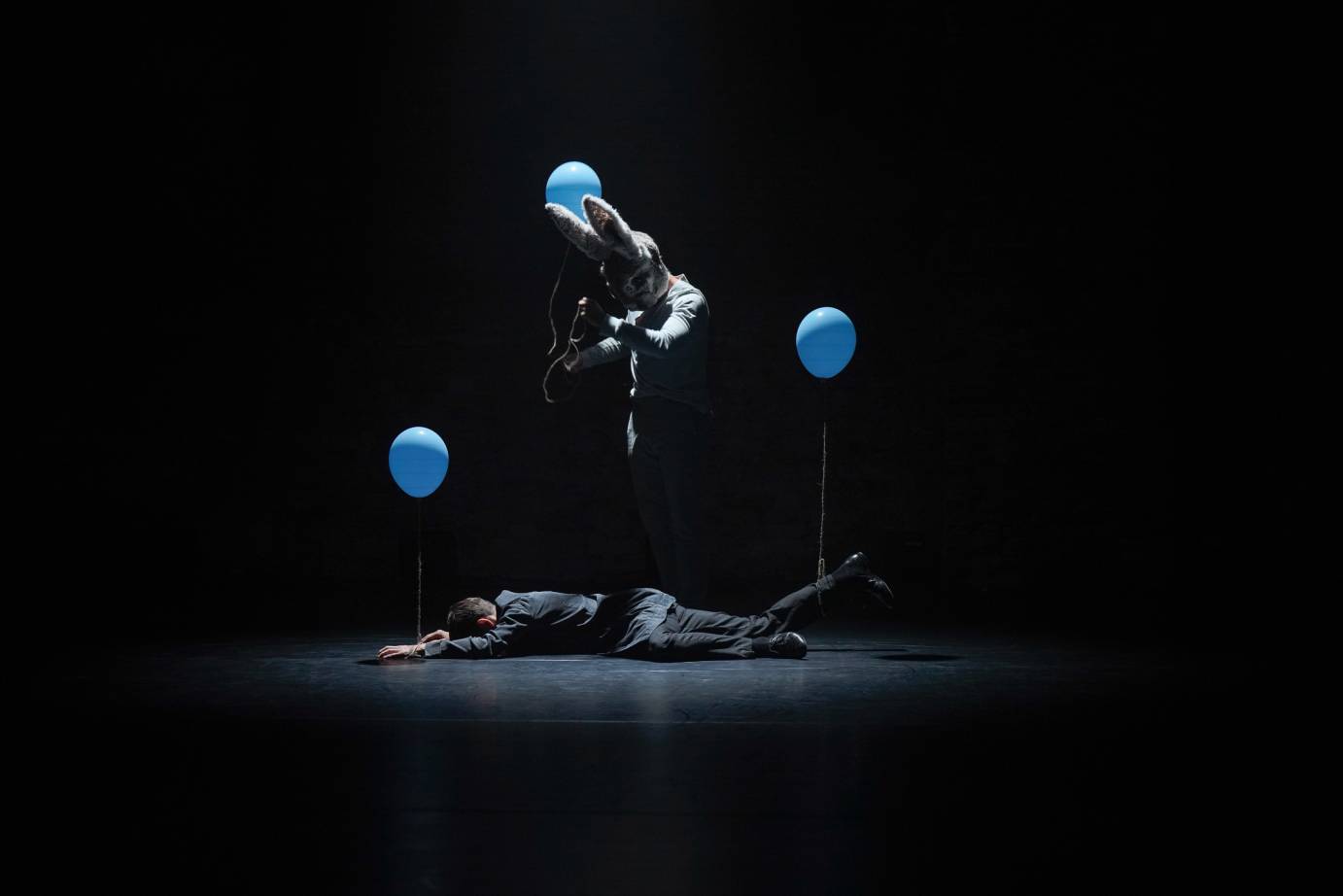 Artale’s rabbit echoes through the scenes as an old friend, a lover, and a confidant, to Lidberg, and even a master of death, as he leads an inflicted Smko — air-filled balloons stuffed inside the sleeves of his clothing to imply succumbing to illness — offstage.
