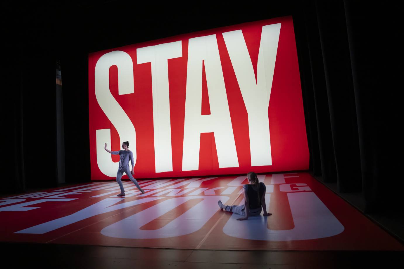 Reflections, the first section of the work, features a juxtaposition that takes some adjusting to. Visually, the set design is not only bright, but loud. "STAY" reads the upstage wall of the Perelman Performing Arts Center (PAC) in bold white letters popping out of a firetruck red scrim. Out of curiosity, I lean over my seat to read more letters that appear on the stage floor. "Stay thinking of me thinking of you," it reads.