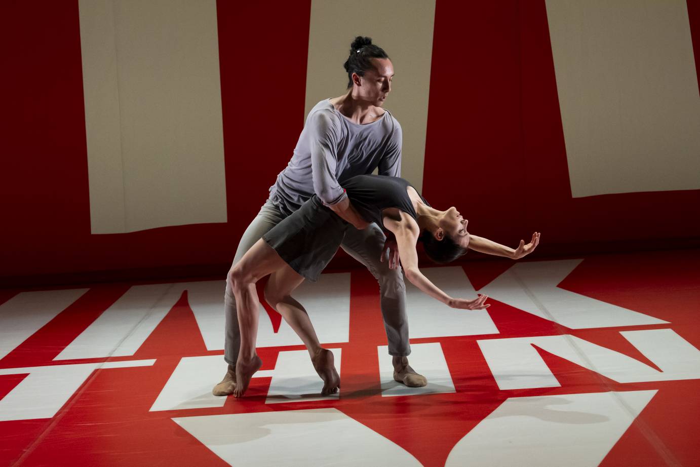 Millepied's fusion of balletic line and modern expansiveness creates a rush of unpredictability. Duets happen in silence. Dance takes place only on certain segments of the stage where one or two words are illuminated. When all five dancers are onstage, they transition among embraces, classical partnering, breakout solos, isolations, and the manipulation of one another's joints beneath Barbara Kruger's dainty, but characterless, garments.