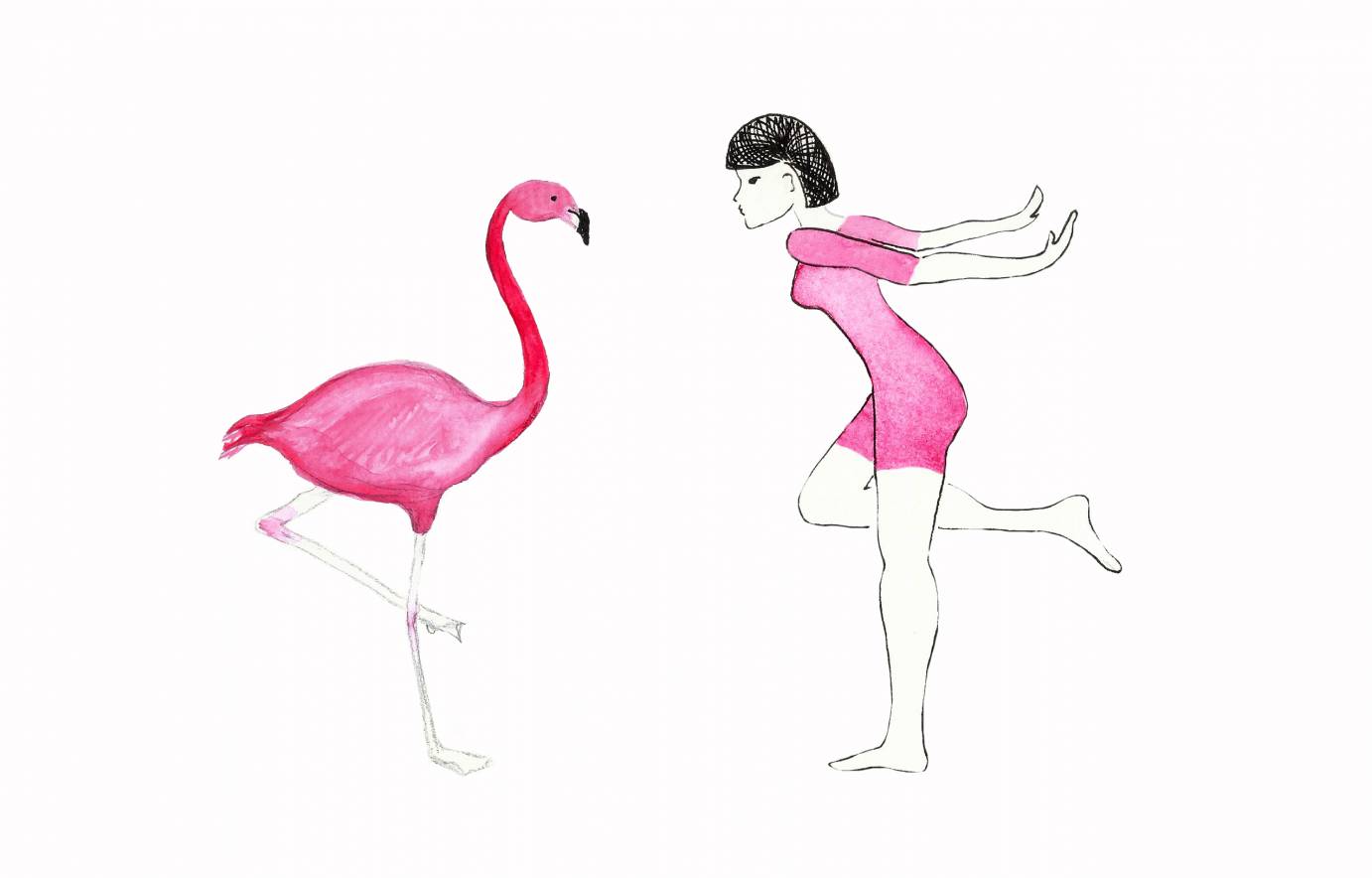 Dressed in identical pink jumpsuits, the twins conjure up the image of graceful pink flamingos within an extra large egg. When the image of a chicken-man hybrid is projected onscreen, I laugh aloud because my private imaginings are communal.