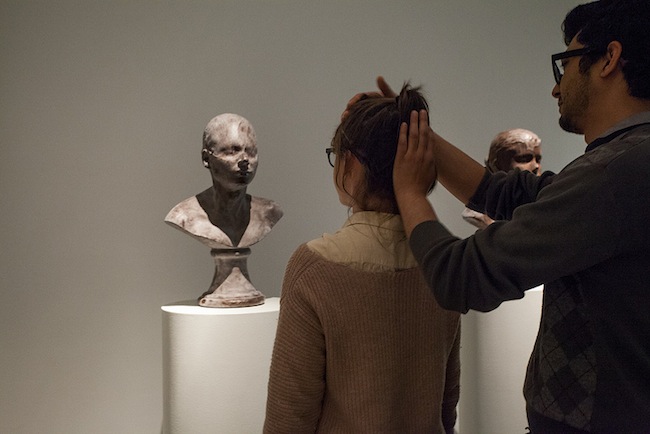 | "Touch Conveyor: Face to Face," participants engage with Janine Antoni's self-portrait busts. Photo by Caitlin Ruttle. |