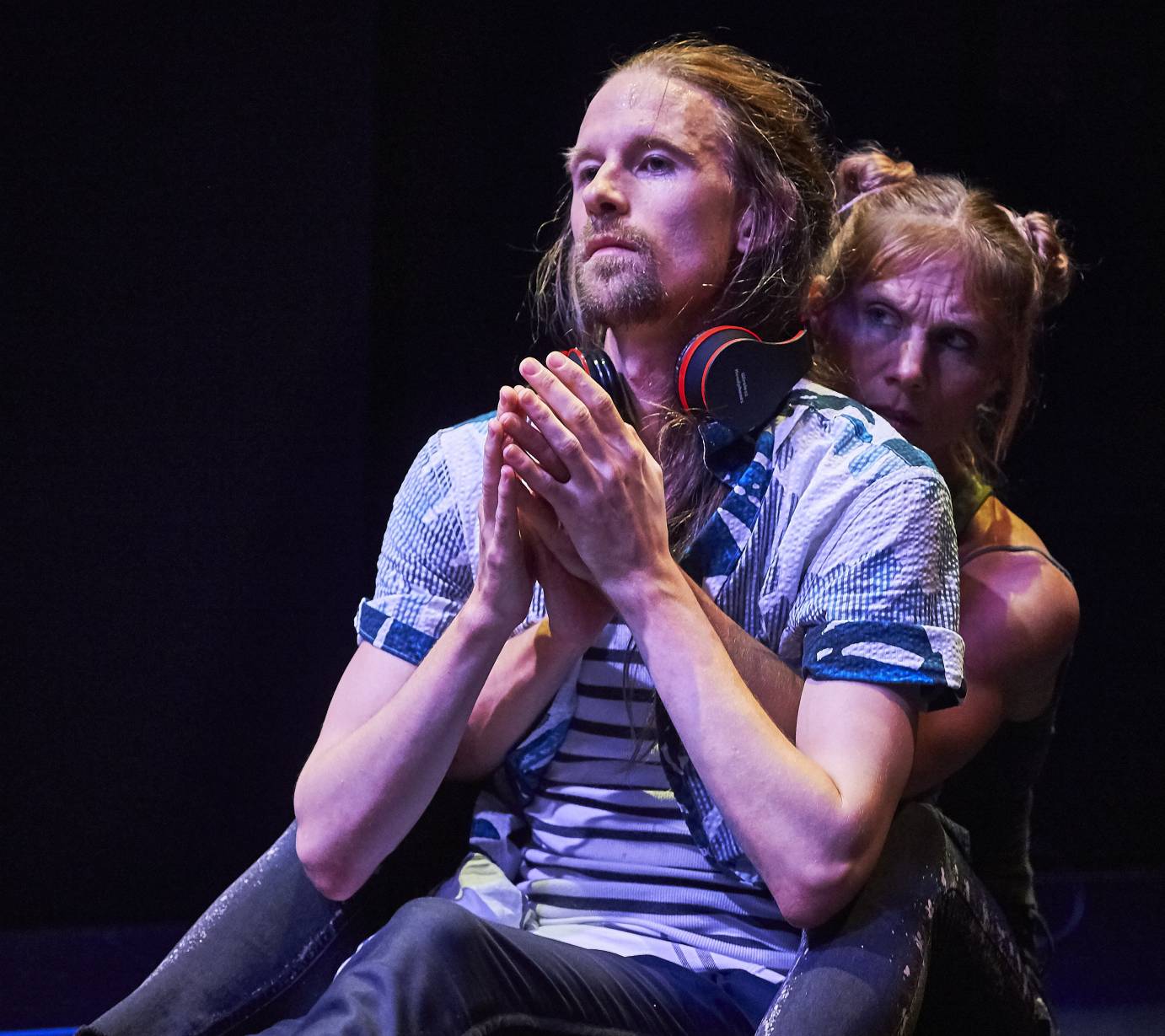 True to contemporary life, Morley’s first action after entering the stage space is to turn away from, and tune out his castmates. Focusing on his private playlist and holding on to his precious wires, Morley manages the slowest descent into demi-plié I’ve seen. He won’t break out of solo bliss until Emily Pope convinces him to concentrate on her. (She has to work at it.)