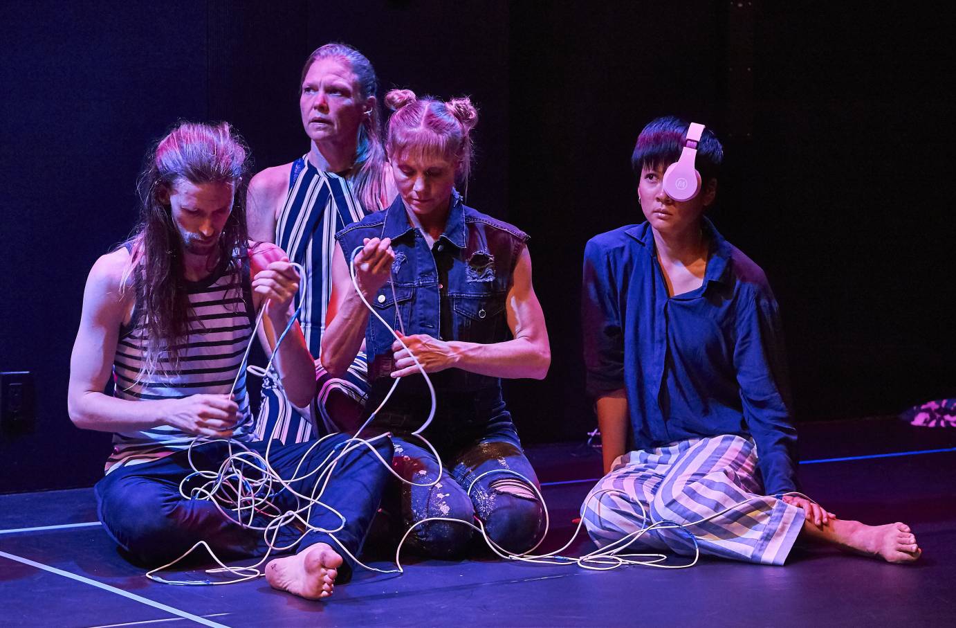 Two hefty sets of headphones — one pale pink and one lime green— are exchanged by the dancers throughout the piece. Wires are also present, a mighty bundle of them, carried in initially by a-headphone-sporting Jordan Morley. (The phones seem to take over his head.) Hmm.
