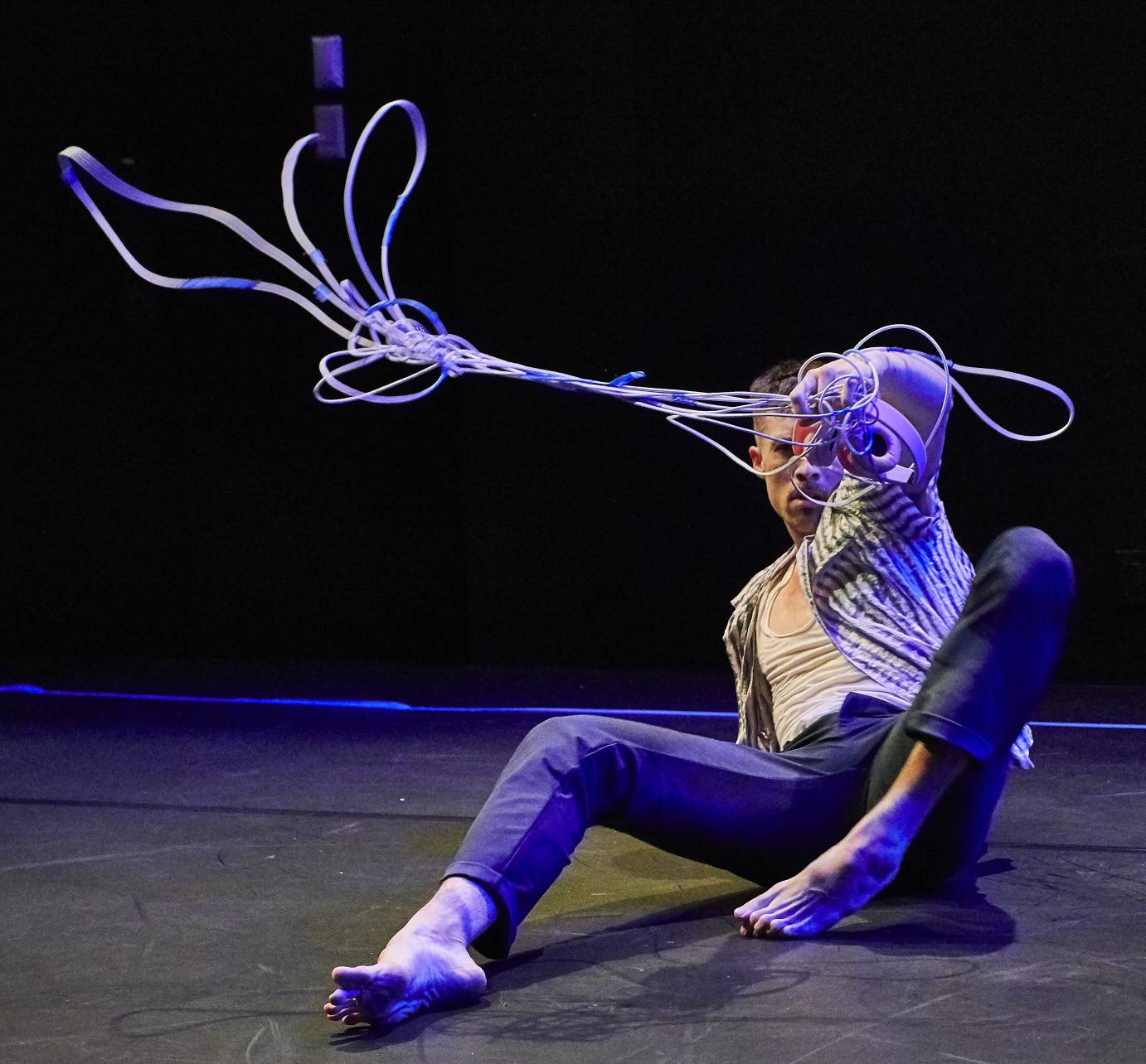 Later, Kenneth Olguin intrigues us, performing a duet with the wires and headphone. (Who’s moving whom?) In one moment, Olguin has a handle on the situation, waving his cables expertly like a cowboy brandishing a lariat. In the next, the jumble of chords seem to knock him around, urging his leg to extend sideways, goading him to the floor.