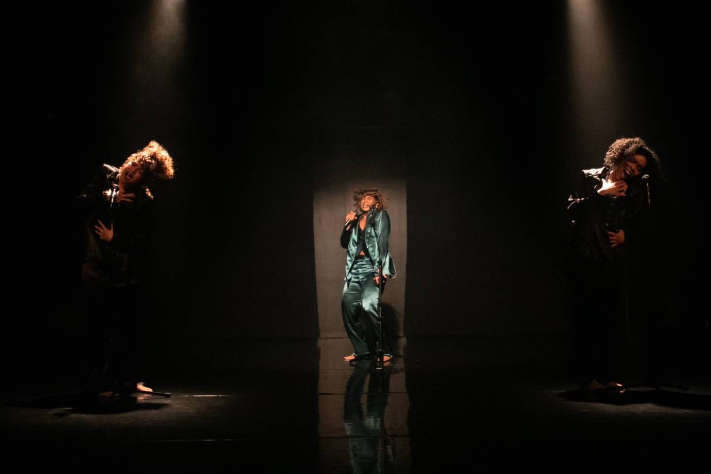 With a sudden shift, the lights black out. The disco ball lowers as a rainbow of color beams through the space. Kancey reemerges, dressed in a dark green blazer layered over a tank top and long pants flanked by Balbuena and Thomas. The trio approaches their microphones (now there is one in the space for each of them) and dances their hearts out. In crisp unison, they rock their microphones in their hands, leaning towards the audience. They swoop around in circles, ripples pulsing through their bodies.
