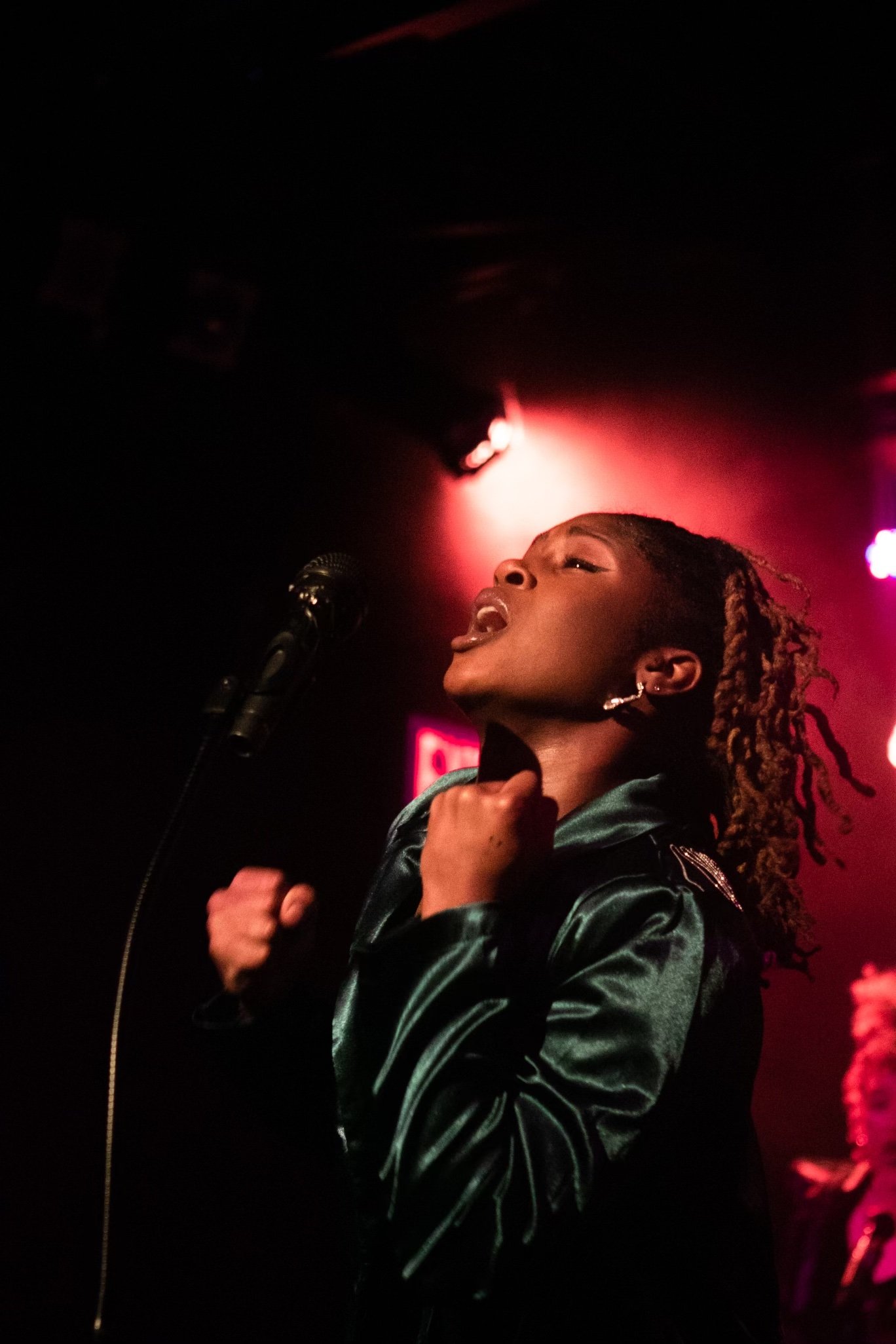 When the lights return, Kancey stands alone facing her sole microphone. She jogs in place towards it, her speed frantically increasing. She sheds her jacket, tossing it to the floor. “Who gon’ save me?” she asks as she runs. Her volume is low at first, but crescendos as she repeats her question. Sprinting, she releases her energy and hurtles downstage with vulnerability and passion.