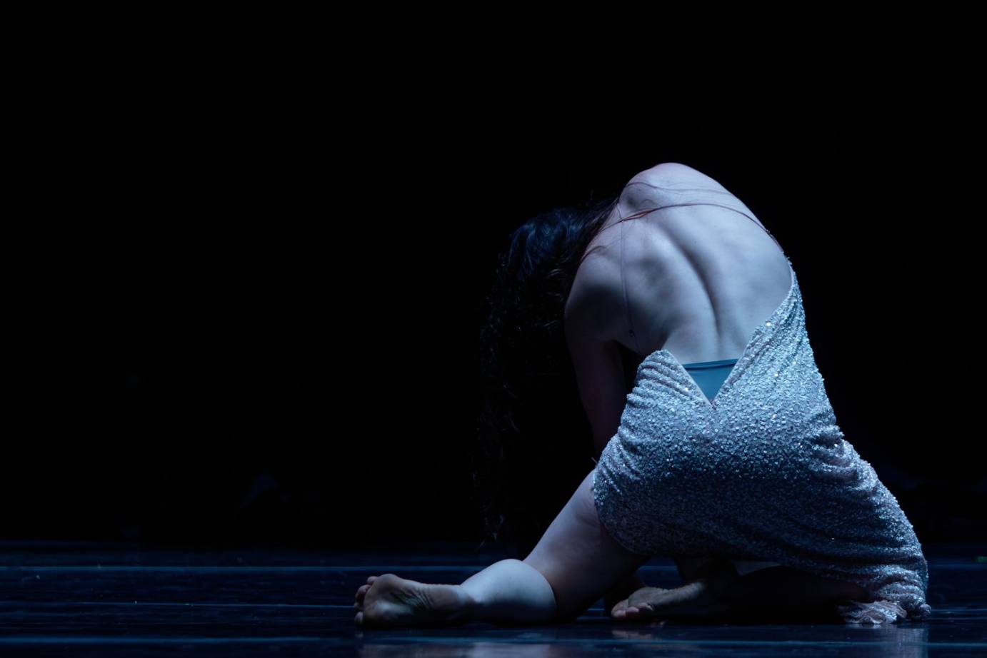 Reservoir immediately tangles its viewers in its ominous cloud. Margolick stands hunched over, draped in a long, elegant dress sparkling amidst the dark lighting. Her hair hangs, hiding herface. She inches her way downstage, tracing the floor with her toes, her palms outstretched. Her fingers curl and uncurl as her wrists invert, and she stretches her upper extremity into contorted shapes.