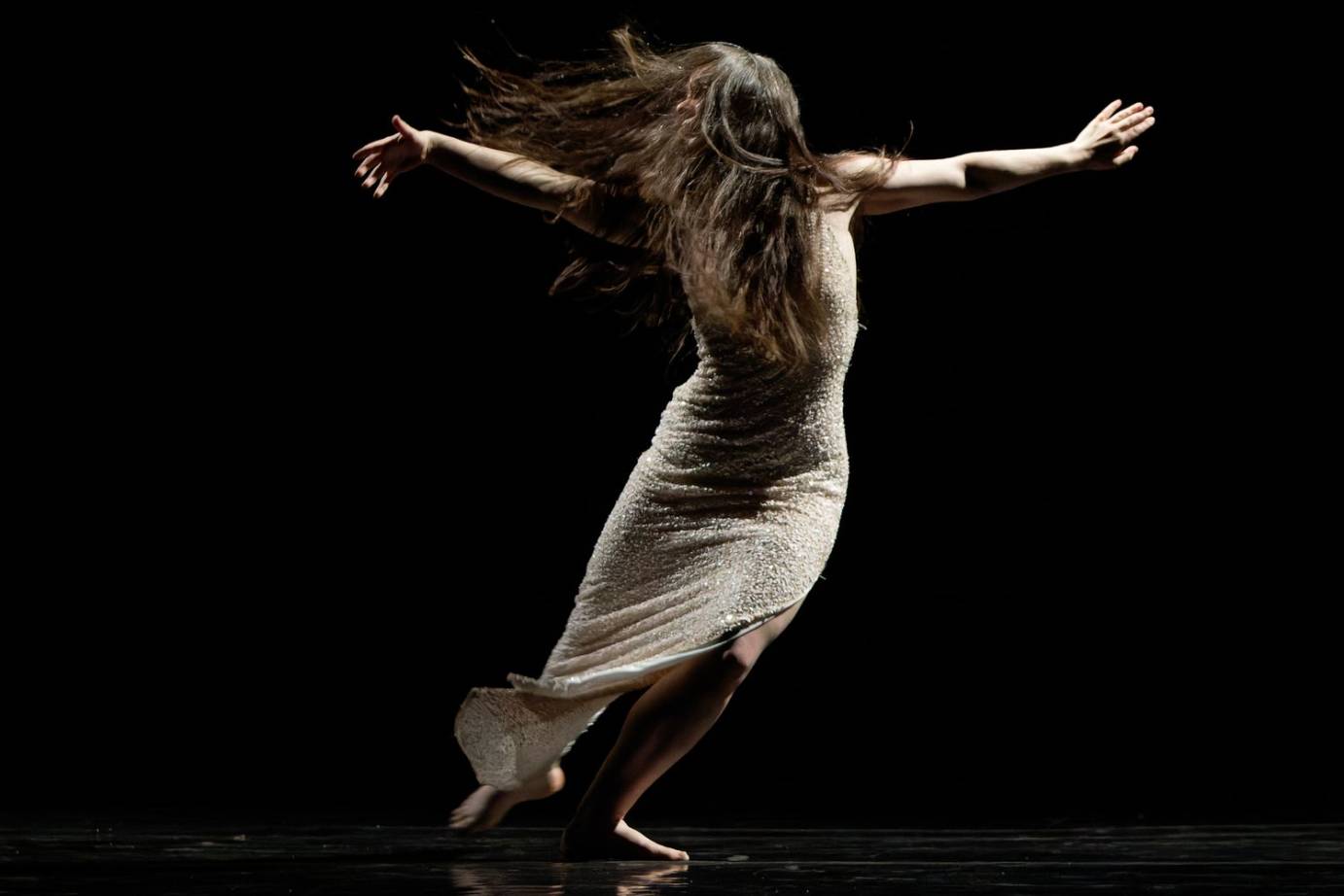 Settling, Margolick delicately places her dress on the floor and dresses herself in a black shirt and black pants. With her hair fully away from her face, she repeats Reservoir’s opening movement. The slow traveling downstage with flickering fingers morphs into fast-paced, vigorous dancing. Margolick’s exhales are audible as the lights fade to black, inviting viewers to ponder the transformation of her character’s spirit.