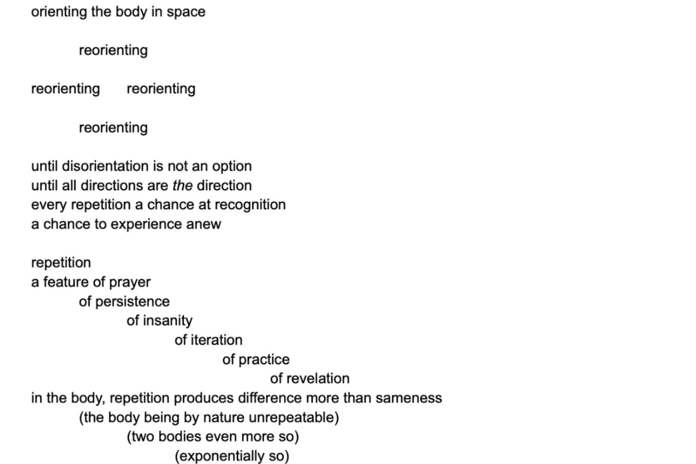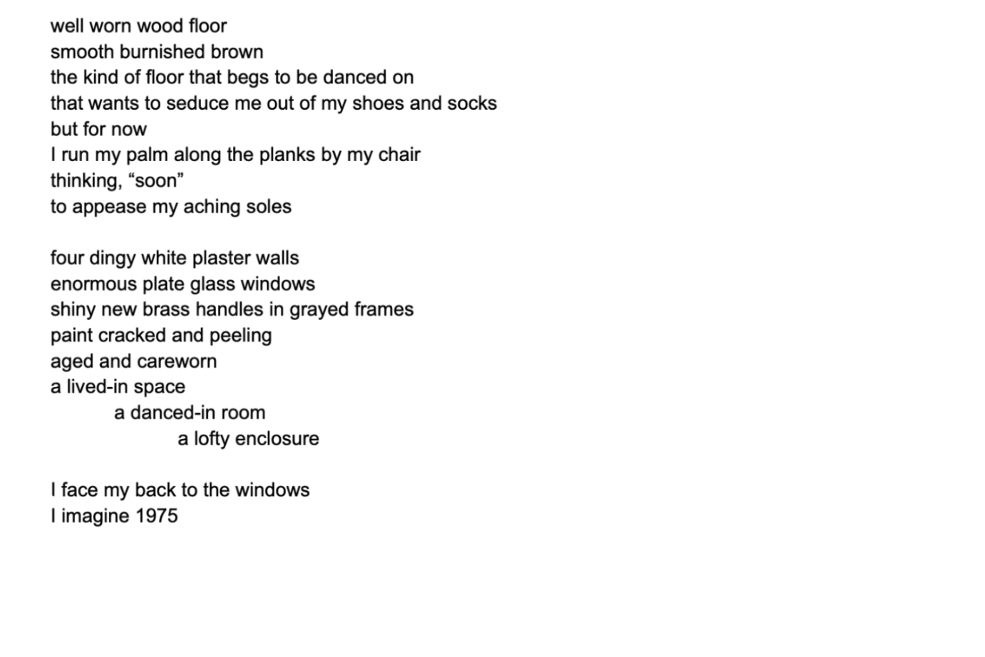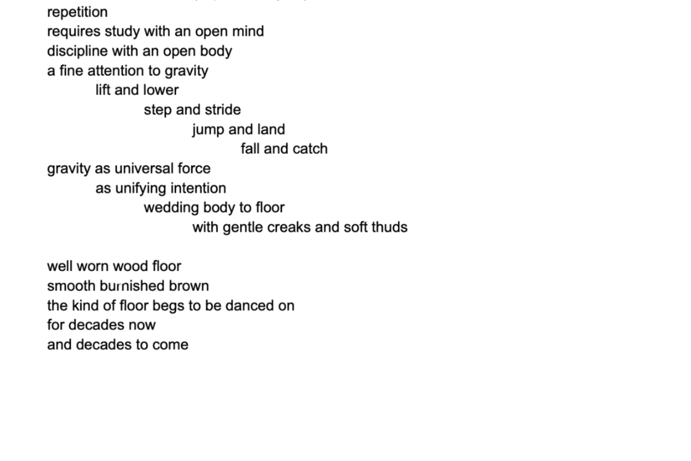 All this pre-show research put me in a reflective mood as I wove through dense Soho crowds on a crisp fall evening. I was grateful to enter a brief reprieve in the loft—a suspension of time in a space of artistic sanctuary that offered both transportive focus and imaginative flight. A notorious early bird, I found myself scribbling in my notebook as the loft slowly filled with audience members bundled by elevator in batches to disperse among the metal folding chairs lining the four walls. As we quieted into observant collectivity, the space’s intimacy and exposure prompted me to put away my notebook and be with the dance.