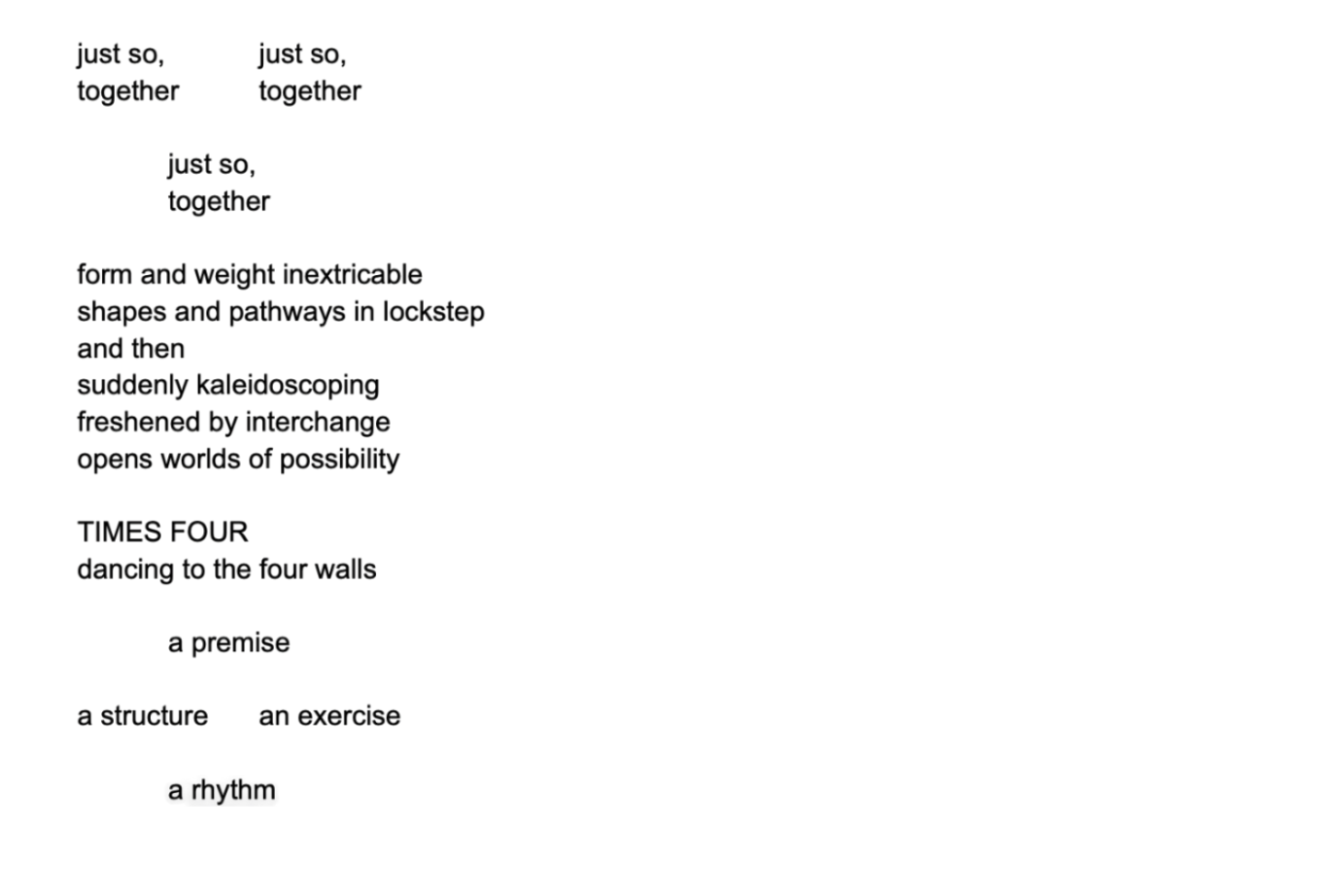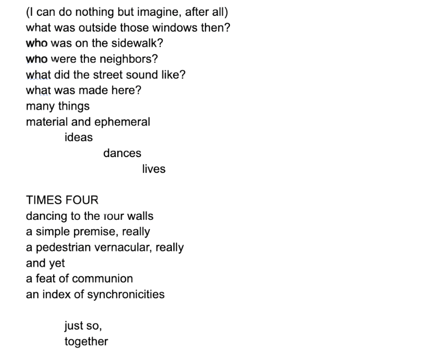 Writing about the work, spanning 1976 to 1980, includes keenly observant and insightful pieces by Sally Banes, Jennifer Dunning, Deborah Jowitt, Wendy Perron, and Marcia B Siegel, as well as an interview with Nancy Stark Smith—copious and storied discourse, both then and now. Decades on, Gia Kourlas contextualizes the historical work, the artists, the space, and the process behind the contemporary rendition of “TIMES FOUR” in a reflective New York Times feature. All of the above are highly recommended reading for viewers of this dance and dance history nerds alike, though the steps themselves and the bodies performing them speak volumes of their own accord.