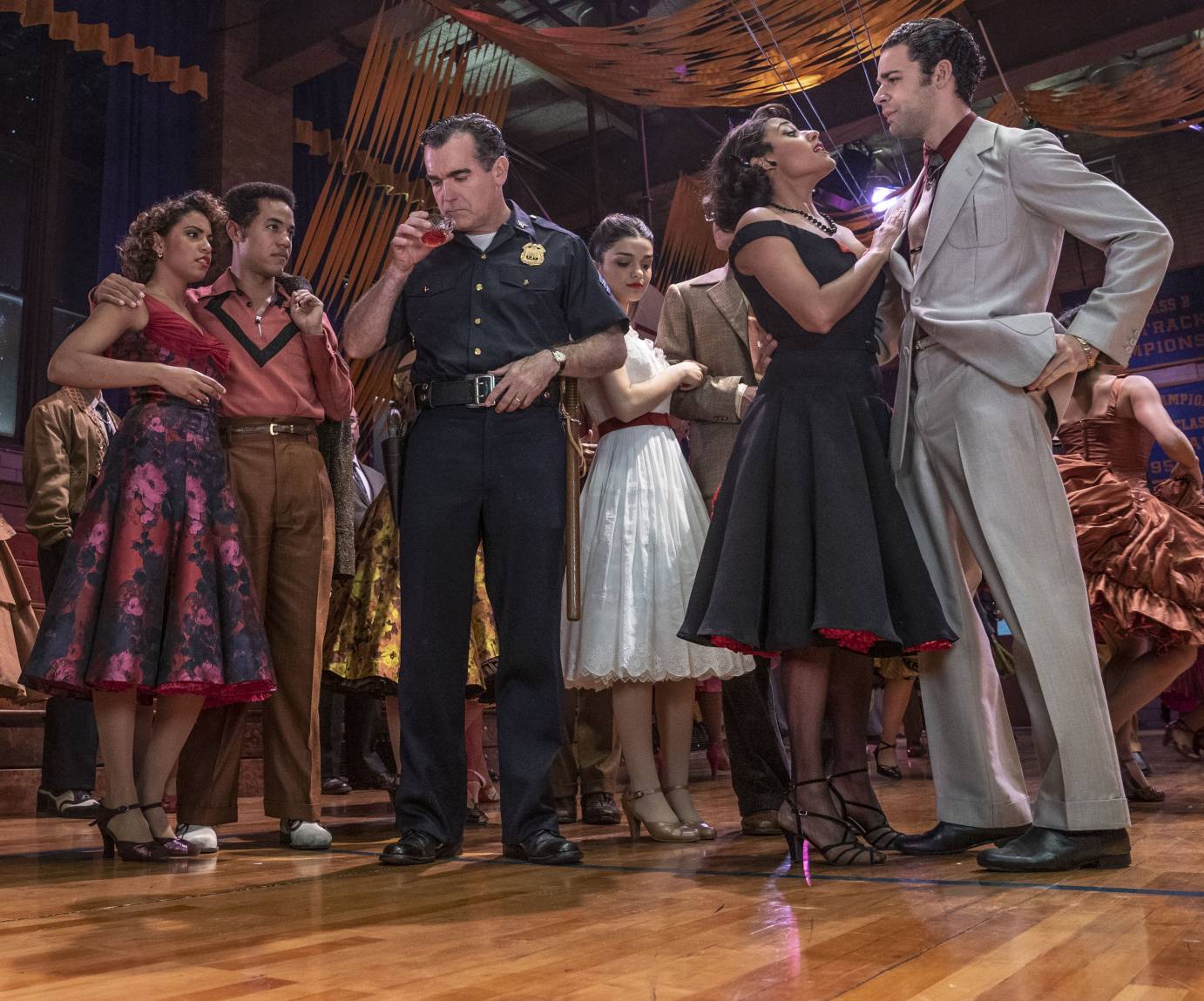 Brian d'Arcy James as Officer Krupke, Rachel Zegler as Maria, Ariana DeBose as Anita, and David Alvarez as Bernardo in 20th Century Studios' WEST SIDE STORY © 20th Century Studios. All Rights Reserved.