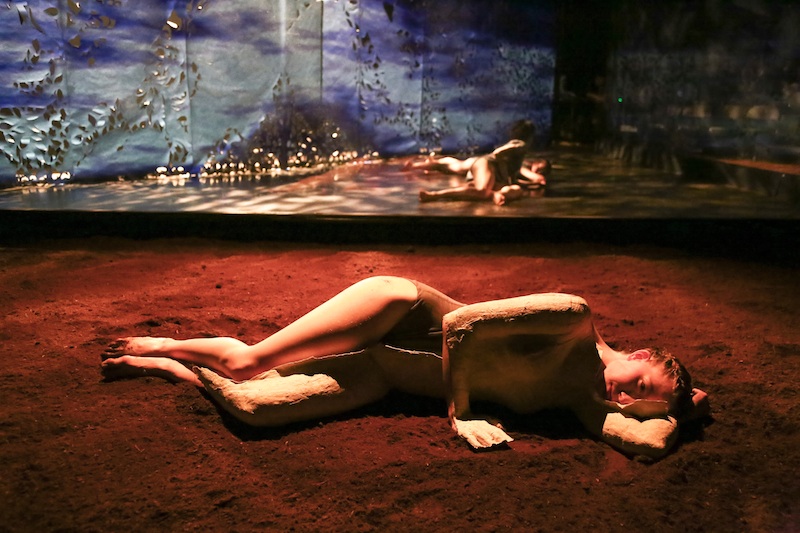 Upon entering, it's the prone form of a girl (Annie Rigney) that commands our attention. She, seemingly in the deepest slumber, lies on her side, body crimped in a serpentine shape. Like a partially birthed butterfly, half of her physique is encased in a paper mâché chrysalis. For the piece’s first part, she reposes until, abandoning this husk, she ghosts in and out of Scofield and Freedman’s pursuits.