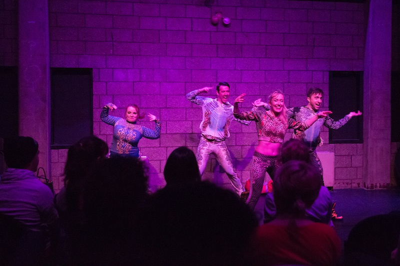 McDonagh and O'Reilly dance until their high kicks buckle them over. They change costumes: O’Reilly in a booth that magically appears and disappears; McDonagh, on top of men in the audience in the guise of an awkward chest/lap dance. Much to the girls’ dismay, the cast doubles with the arrival of Duane Watters and Neil O’Brien. After a cheesy, finger pointing, pelvis thrusting routine, the scene slips to slapstick as O’Reilly jumps at the three to be caught, only to fall at their feet. The setting becomes momentarily violent as she gets her forehead bumped into the brick wall.