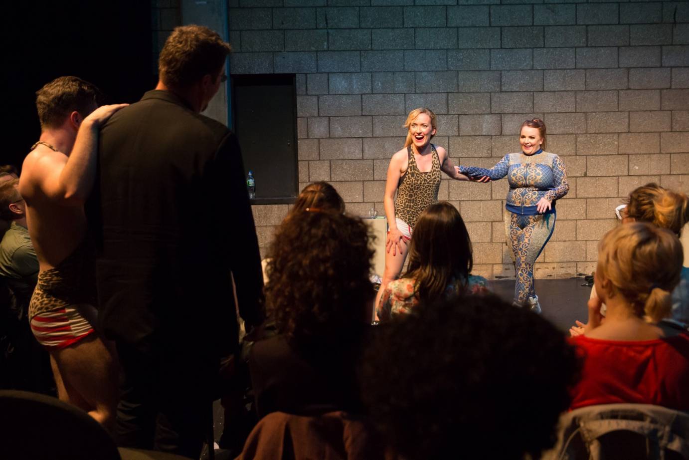 This short romp begins with Leonie McDonagh telling us that the reason we are all here is to get Paula (who is late…always late) a man. McDonagh, a lanky blonde, collects the names of the men in the audience, perusing them with the scrutiny of a matchmaker. As Paula fails to show the mood dips. O’Reilly, round and short, finally busts in from behind the audience grabbing selfies and our attention with her charismatic, crazy spunk. With Paula’s arrival, the show soars to giggly, campy heaven.