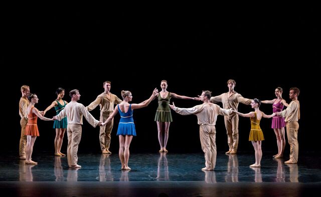 The next thing we see is a couple embracing. John Selya and Savannah Lowery swivel cozily, try out a polka step and finally reveal their hearts’ ambition in a reach-for-the-stars ballet lift. With Lowery’s lines unfurled dramatically above Selya’s head, they circle toward the exit — Tharp’s first reference to the so-called “circle of fifths” that Bach follows in his exercises for piano. Her Preludes and Fugues will end with circles, too. Returning to the C Major Prelude that begins the series, she will arrange the cast in a ring, facing inward with hands clasped, as if the love uniting the opening couple had spread through the community.