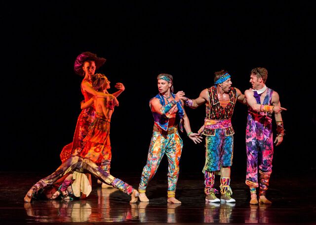 Tharp’s new Preludes and Fugues offers a formal suite of dances, exquisitely calibrated and set to excerpts from Bach’s "Well-Tempered Clavier.” In the second piece on the program, titled Yowzie, disorderly impulses rule and a gang of scruffy but loveable characters go on the prowl, while we listen to music by Ferdinand “Jelly Roll” Morton and other NOLA greats, selected from an album called “Viper’s Drag.” Santo Loquasto has supplied the costumes and the look of each piece, giving Preludes and Fugues a low-key elegance and making Yowzie psychedelic, with the dancers wearing tie-dye rags and with planets spinning on the backdrop.