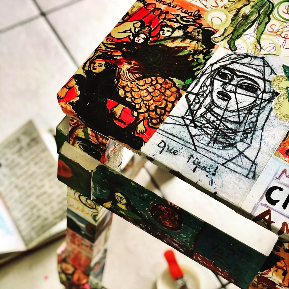 I’m thinking of and talking to Tony Hall now. Tony Hall — the late, great Trinidadian playwright, mentor, colleague, friend — who joined the ancestors last month. I’m thinking of the aforementioned Aunty Girly, whose old kitchen stool I recently covered in the pages of Frida Kahlo’s diary. Kahlo has, perhaps, the most famous artist kitchen in the world. It’s now obvious to me why, in this global pandemic, I’ve been spending time with Frida. She spend a lot of her time in her home. These ancestors of mine — artistic and familial — they must be served, as they served us. I honor their realness, originality, generosity, humility, and brilliance; their roles and investment in my life. And it makes me feel safe. I know they have me.