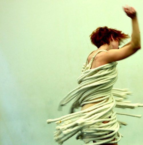 The costume in the above picture is by Buffy Price- Director of Dance at GMU. It is made from furniture upholstery finishing. I had been looking for something to rearrange space and echo our own movements. Buffy had been inspired by a creation she was in by Nancy Meehan and had already made this piece. She let me jump inside and I felt at home. I was able to cut space and I felt incorporating this costume/piece into mine would help me accomplish my goals of GERME.
