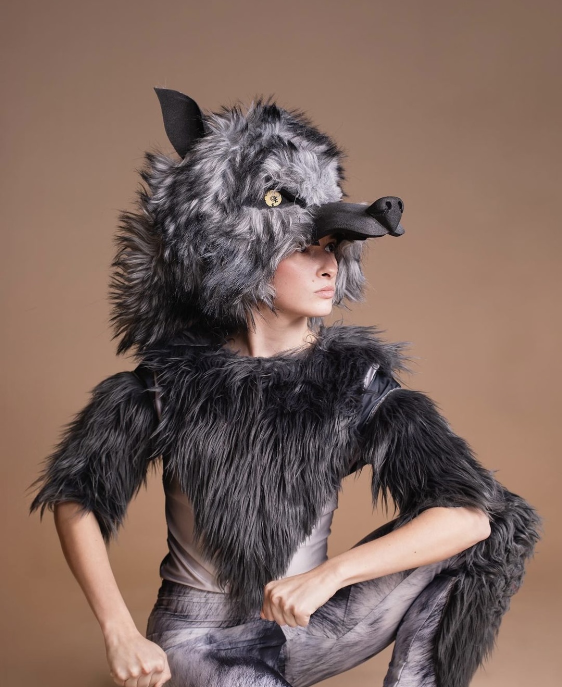 We wear detailed costumes. Everything is tailored to resemble the animals we're portraying. Headpieces ensure we appear more realistic. During rehearsals, we have to consider these large headpieces in our spacing. They can make forming small herds on stage challenging -- lots of bumping into each other! We also have to be aware of how our heads are positioned so that the audience will notice our character's masks, and not our faces. When my mask is on, for example, I need to gaze downwards to showcase my Mother Wolf expression.