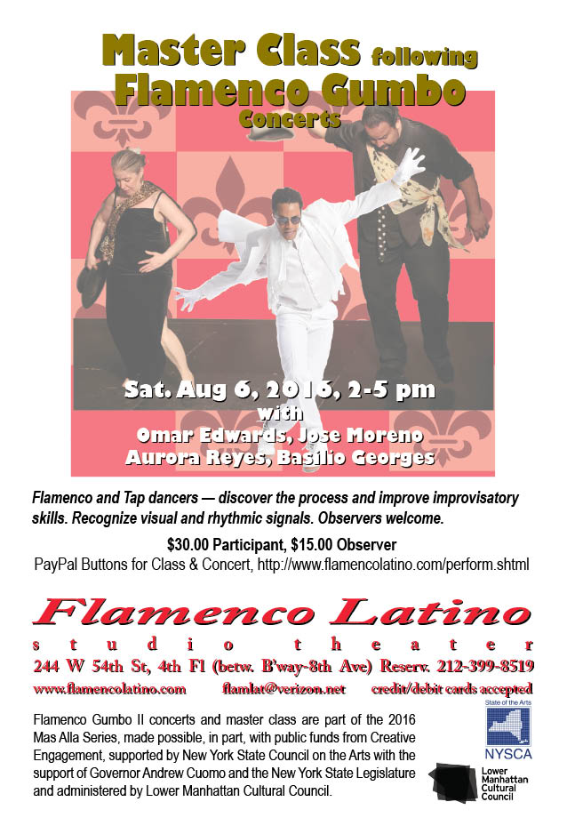 We welcome you to join us for Flamenco Latino’s Más Allá Series this summer. We will feature four performances of our Flamenco Gumbo II at the Flamenco Latino Studio Theatre. Then on Aug. 6, 2016, from 2PM to 5PM we will offer a master class for Flamenco and Tap dancers to encounter our singular style with its unique visual and rhythmic signals.