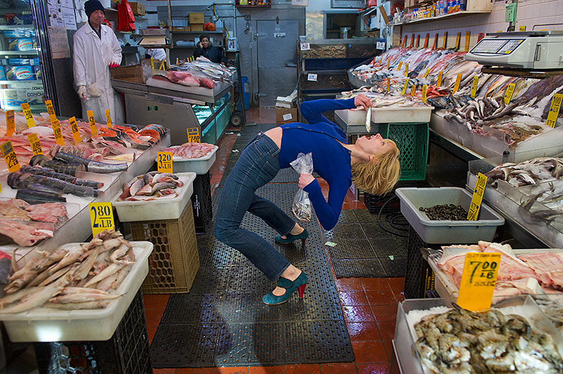 As usual, I had no specific plans. Heather has great energy, so I figured we'd just improvise. I was attracted to the colors in the streets, but I didn't see a lot of potential for interesting scenarios. Plus it was (once again) really cold and windy, and I didn't think Spiderman could stand to lose another cast member to injury. So I decided to keep the jumping to interior locations.-Jordan Matter