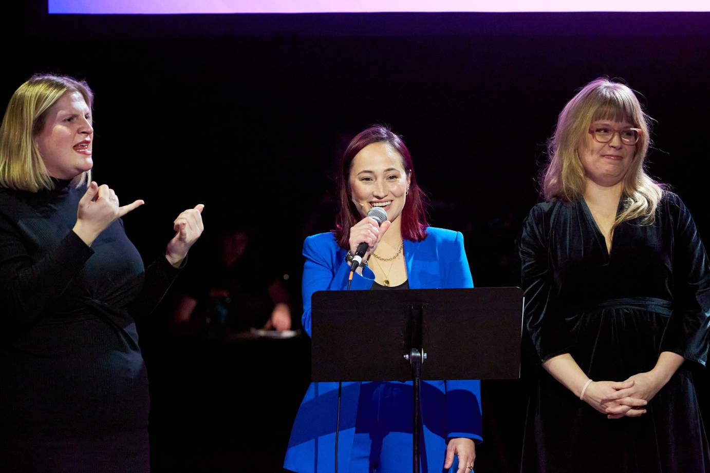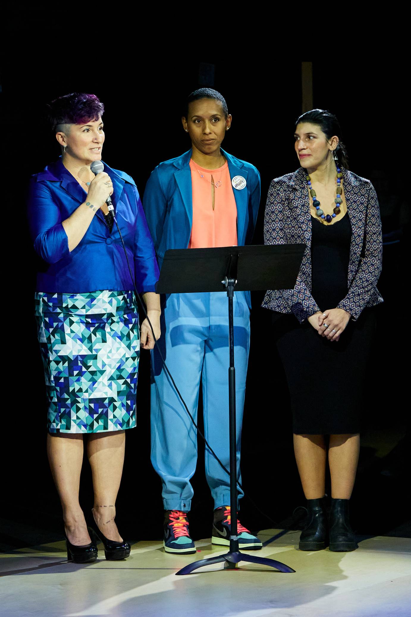 Alejandra Duque Cifuentes of ADC Consulting and Carrie Blake of Webb Mgmt present during the State of NYC Dance event. ASL Interpreter Erin Murray stands to their left.; Photo: Jeffrey Lee/On The Spot Image