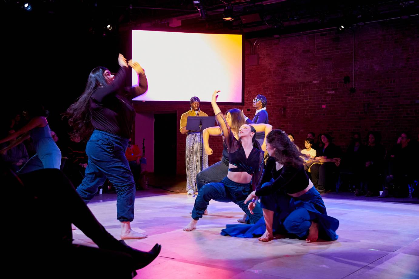 Dancers Joan Bradford, Rebecca Gual, Lorena Jaramillo, and Jessica Lee from SLMDances perform during the State of NYC Dance event. J. Bouey stands at the back speaking into a microphone. ASL Interpreter Lisa Lockley stands to the side. Photo: Jeffrey Lee/On The Spot Image