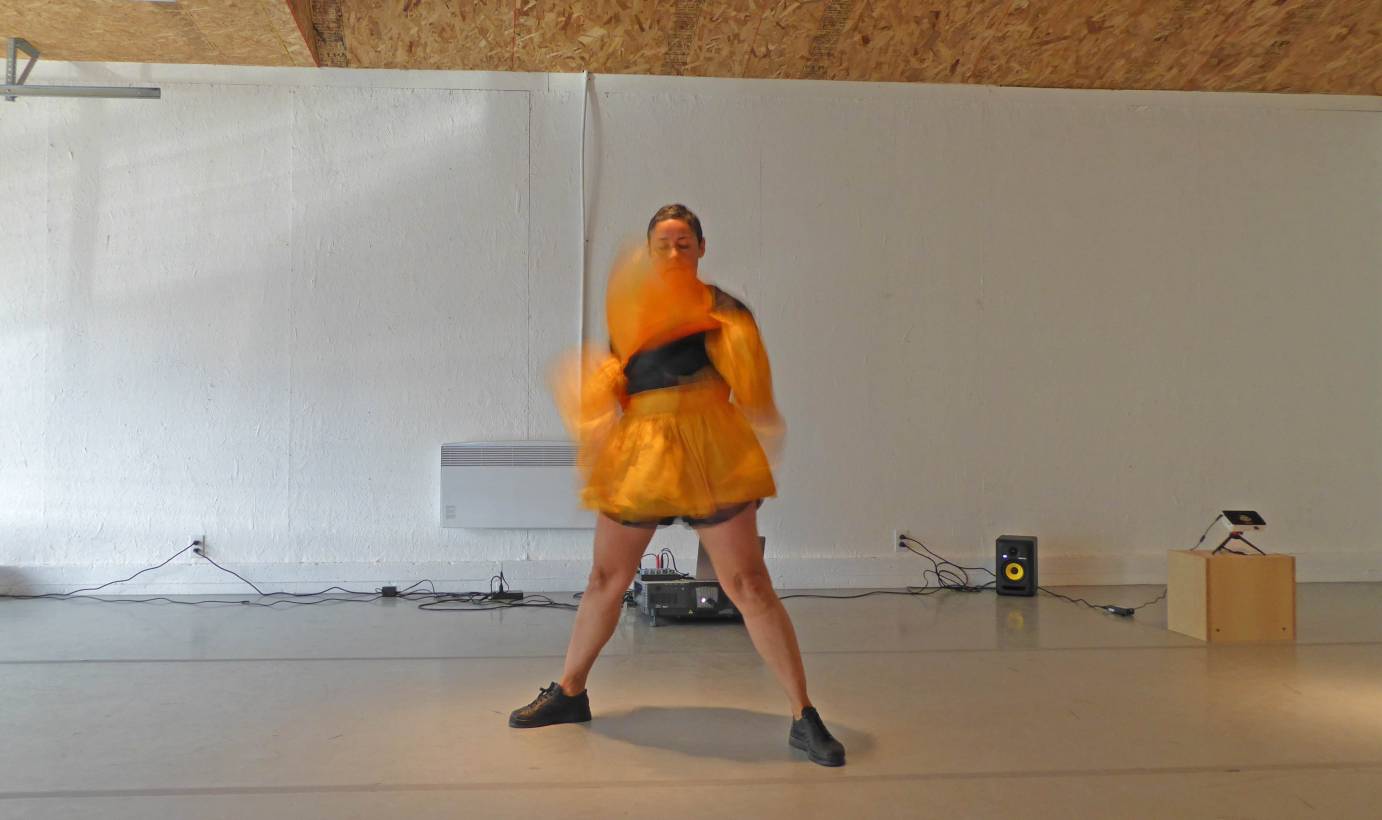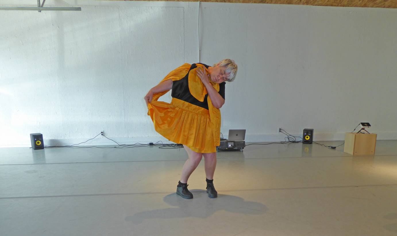 Karen Bernard: The yellow and black taffeta dress was made for me by a young designer in the early 1980s. I think of it as a Bauhaus-constructed cheerleader uniform. It no longer fits me, so I began to think of it as a missing body— and yet it fits Lisa Parra, my younger self. Who was the missing body? And so, it began. I watched a wide range of films from Kill Bill to when Harry Met Sally. Lisa’s solo was influenced by the Beyoncé movie Homecoming. I loved it. Wow what a body, what charisma, and great staging. What I found out was that she stole the movement from choreographer Anne Teresa de Keersmaeker. So, I decided to steal from Beyoncé. Lisa ran with it to the digital sound of Boris Billier, breaking the movement up, repeating, and standing up against the violence.