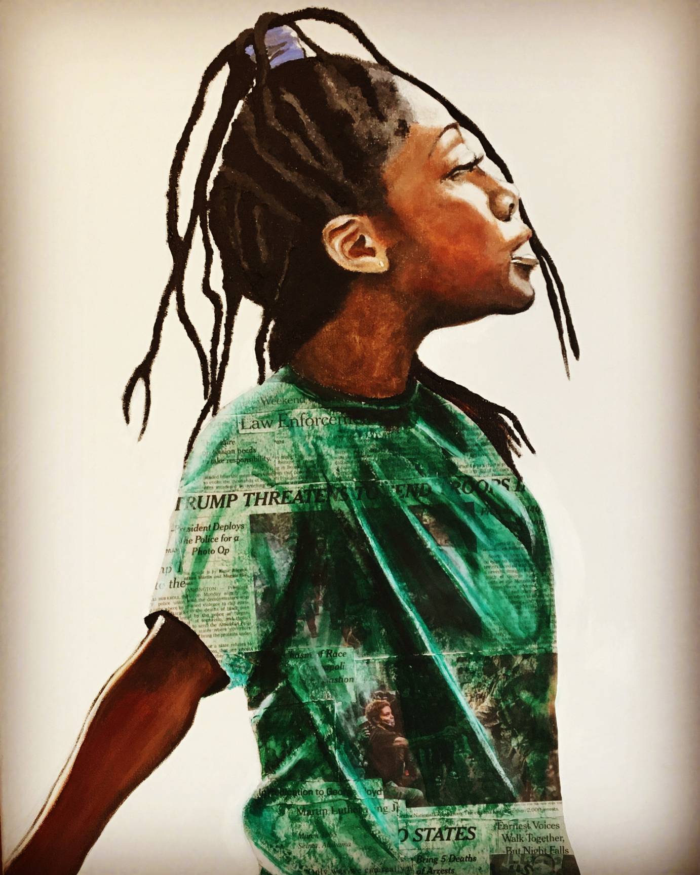 I had a photograph of one of my young I Have A Dream students that I had cherished for years and I wanted to make it into a painting. Because it was during the pandemic and lock down, all art stores were closed and I had a very limited supply of canvases. One of my canvases had a small puncture in it, but I was determined to use it because I was running out and couldn’t get more.